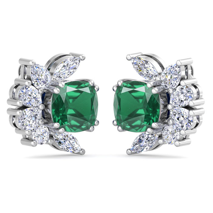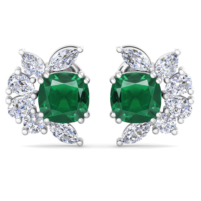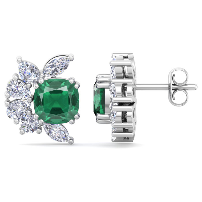 These amazing emerald earrings feature two cushion cut created emerald gemstones totaling 1 1/3 carats. They are surrounded by round, pear and marquise lab grown diamonds in G-H color, VS clarity. Total carat weight is 1 3/4 carats. These earrings are in 14 karat white gold and have post with friction backs.