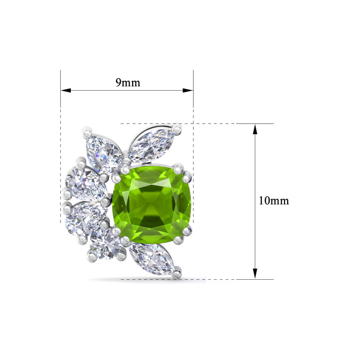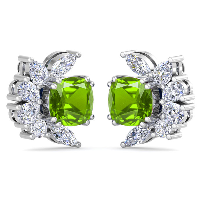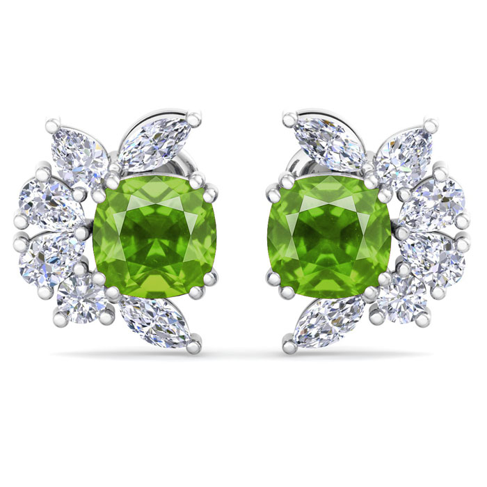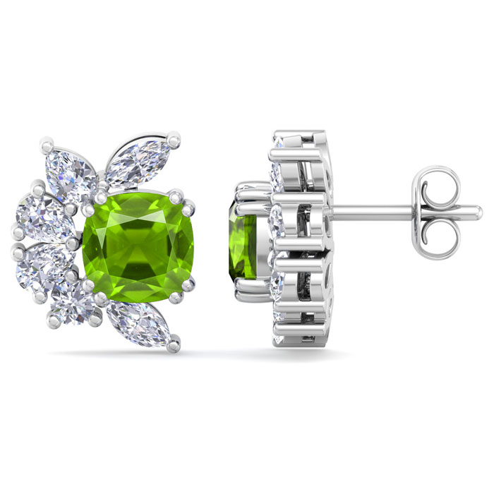 These amazing peridot earrings feature two cushion cut peridot gemstones totaling 1 1/3 carats. They are surrounded by round, pear and marquise lab grown diamonds in G-H color, VS clarity. Total carat weight is 1 3/4 carats. These earrings are in 14 karat white gold and have post with friction backs.