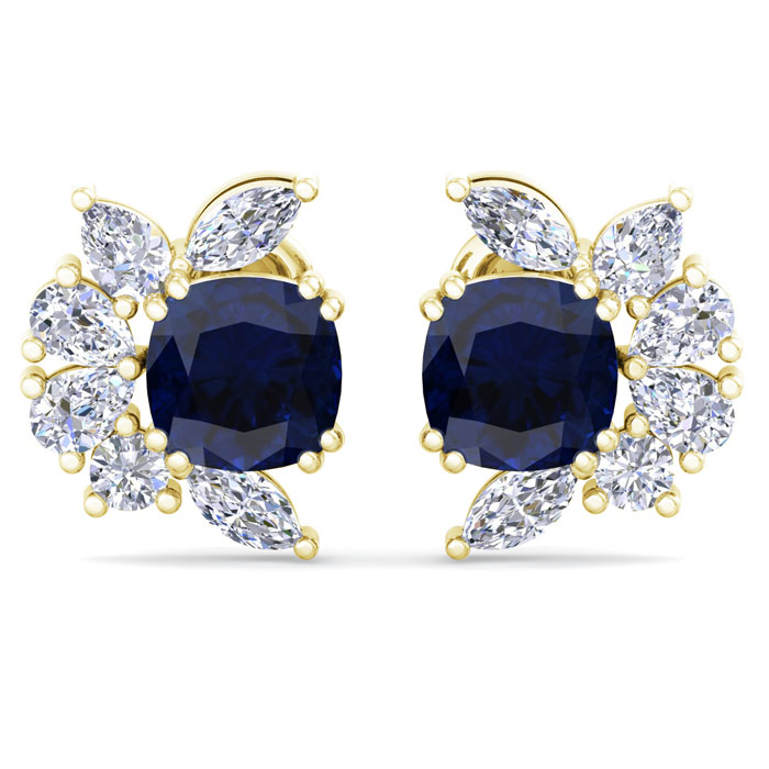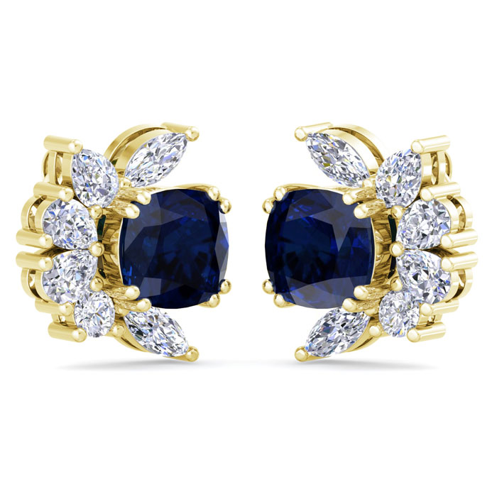 These amazing sapphire earrings feature two cushion cut created sapphire gemstones totaling 1 1/3 carats. They are surrounded by round, pear and marquise lab grown diamonds in G-H color, VS clarity. Total carat weight is 1 3/4 carats. These earrings are in 14 karat yellow gold and have post with friction backs.