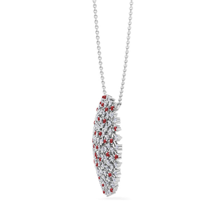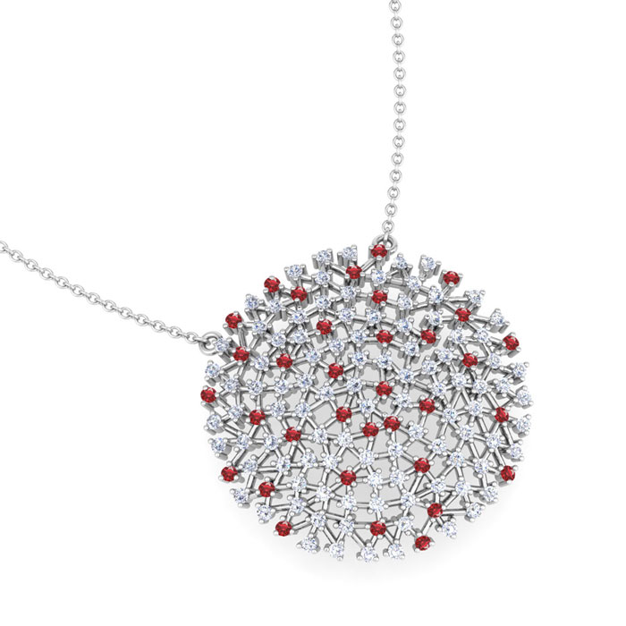 This amazing ruby and lab grown diamond necklace features 134 lab grown diamonds and created ruby gemstones totaling 2 1/2 carats. Each necklace is unique, so the number of gemstones will vary! Lab grown diamonds are in G-H color, VS clarity. This necklace is in sterling silver and has a cable chain with a lobster-claw clasp that adjusts from 15-17 inches.