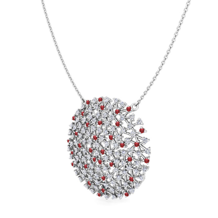 This amazing ruby and lab grown diamond necklace features 134 lab grown diamonds and created ruby gemstones totaling 2 1/2 carats. Each necklace is unique, so the number of gemstones will vary! Lab grown diamonds are in G-H color, VS clarity. This necklace is in sterling silver and has a cable chain with a lobster-claw clasp that adjusts from 15-17 inches.