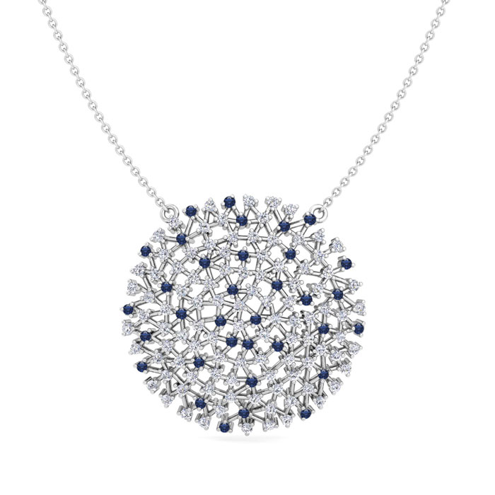 This amazing sapphire and lab grown diamond necklace features 134 lab grown diamonds and created sapphire gemstones totaling 2 1/2 carats. Each necklace is unique, so the number of gemstones will vary! Lab grown diamonds are in G-H color, VS clarity. This necklace is in sterling silver and has a cable chain with a lobster-claw clasp that adjusts from 15-17 inches.