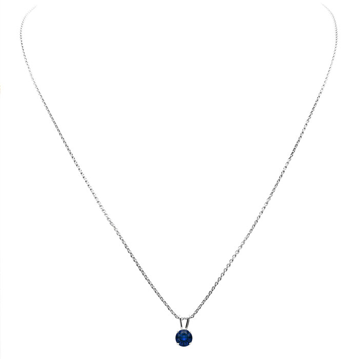 This amazing sapphire necklace features one created sapphire gemstone totaling 3/4 carat. This necklace is in 14 karat white gold filled metal and comes with a free, 18 inch, sterling silver cable chain with a spring-ring clasp.