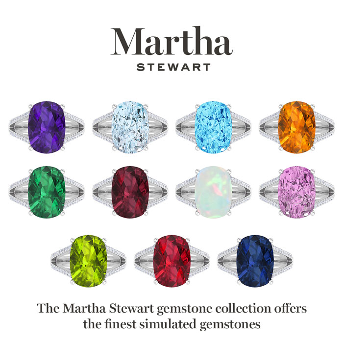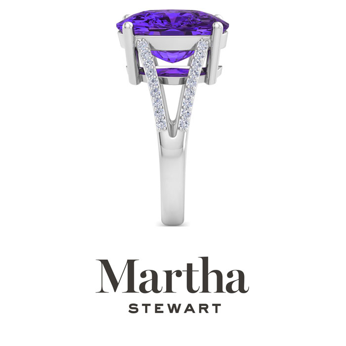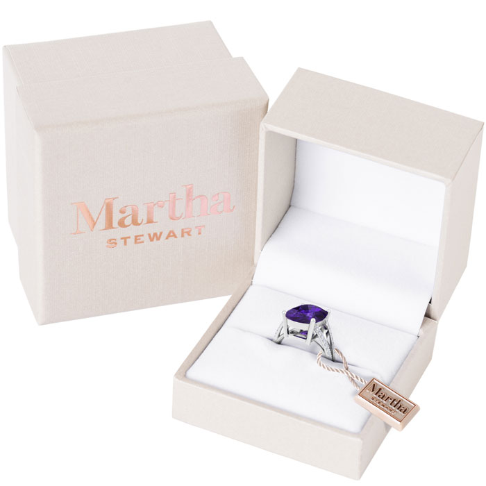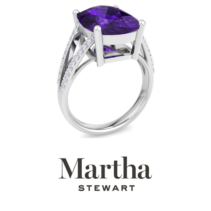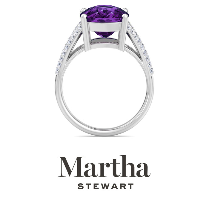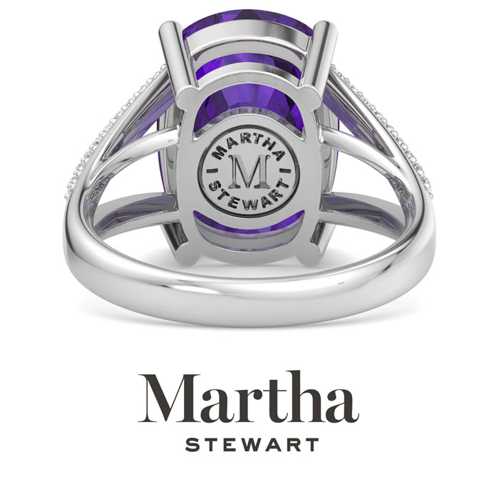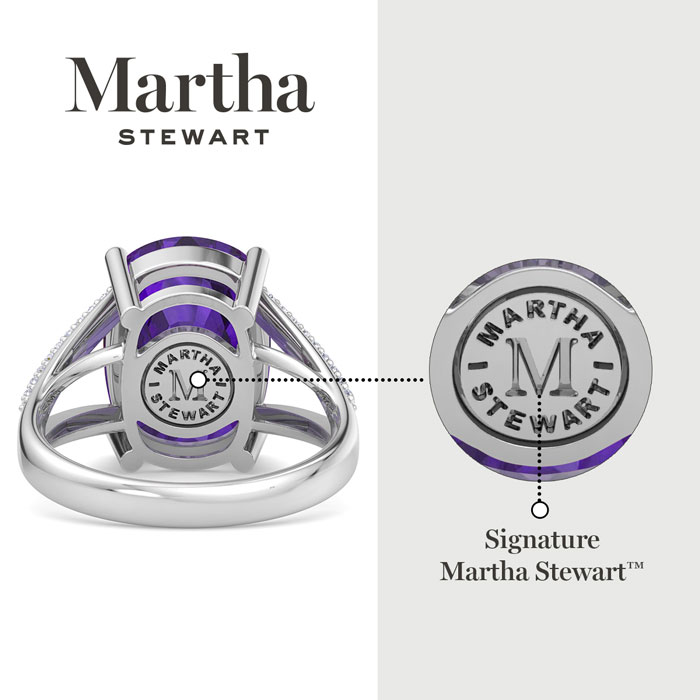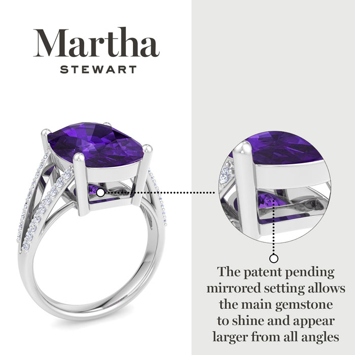 Showcasing class, style and timeless elegance, the Martha Stewart bridge jewelry collection is here to be celebrated. This collection features the finest gemstones and lab grown diamonds set in sterling silver. This Martha Stewart gemstone ring features one 14x10mm cushion cut synthetic amethyst gemstone weighing 10 carats. There are 36 lab grown diamonds in G-H color, VS clarity. Total carat weight is approximately 10 1/4 carats. This ring is beautifully crafted in sterling silver, combining quality with timeless style. Featuring a comfort fit band, the Martha Stewart design ensures both secure and comfortable wear for any occasion. This ring showcases a patent-pending mirrored setting, designed to enhance the color and brilliance of the primary gemstone, making it even more captivating.