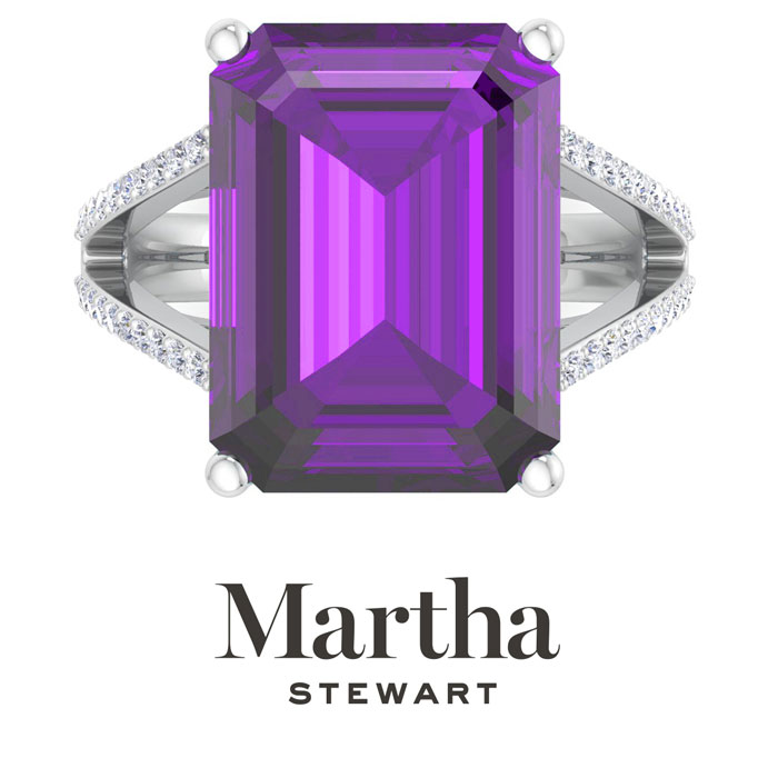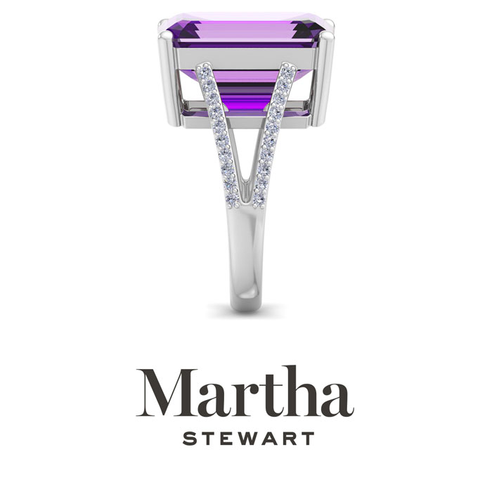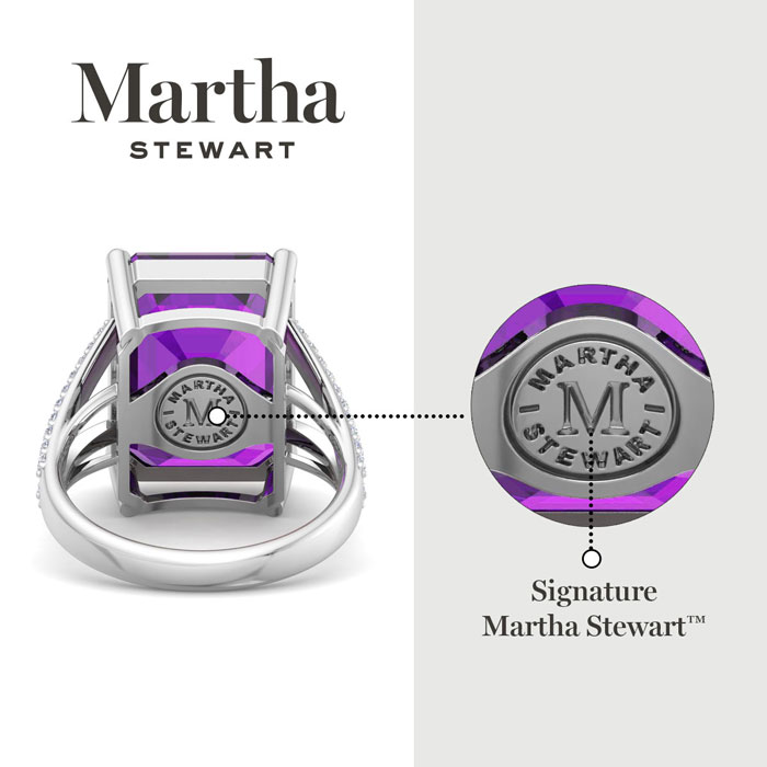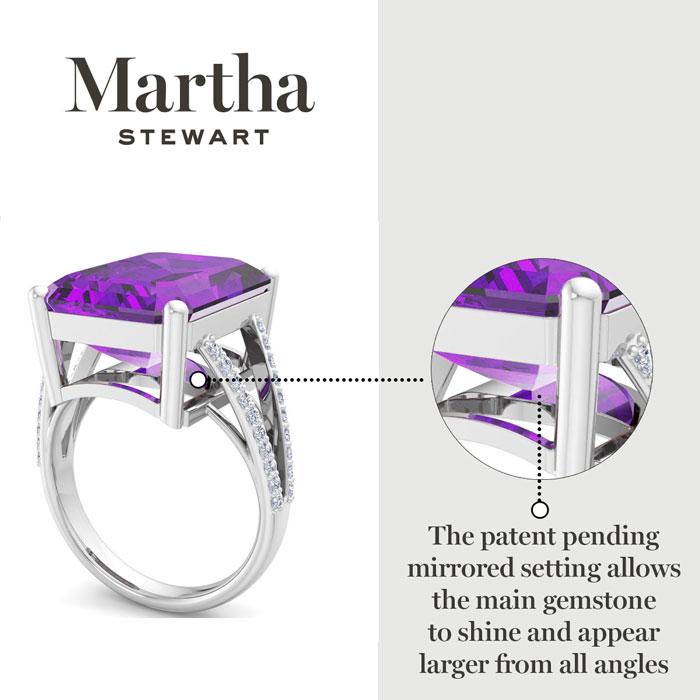 Showcasing class, style and timeless elegance, the Martha Stewart bridge jewelry collection is here to be celebrated. This collection features the finest gemstones and lab grown diamonds set in sterling silver. This Martha Stewart gemstone ring features one 16x12mm emerald cut synthetic amethyst gemstone weighing 10 carats. There are 40 lab grown diamonds in G-H color, VS clarity. Total carat weight is approximately 10 1/4 carats. This ring is beautifully crafted in sterling silver, combining quality with timeless style. Featuring a comfort fit band, the Martha Stewart design ensures both secure and comfortable wear for any occasion. This ring showcases a patent-pending mirrored setting, designed to enhance the color and brilliance of the primary gemstone, making it even more captivating.