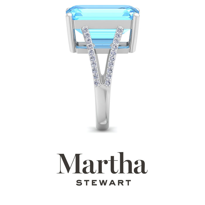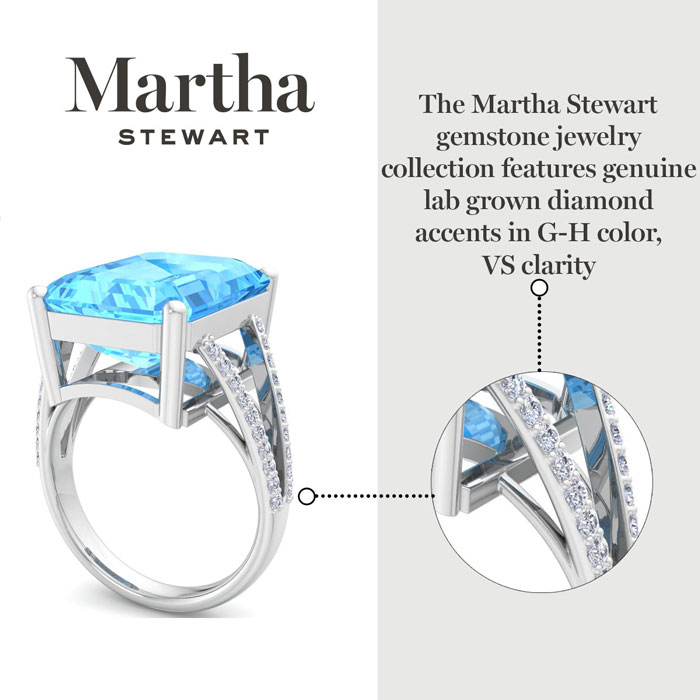 Showcasing class, style and timeless elegance, the Martha Stewart bridge jewelry collection is here to be celebrated. This collection features the finest gemstones and lab grown diamonds set in sterling silver. This Martha Stewart gemstone ring features one 16x12mm emerald cut simulated blue topaz gemstone weighing 10 carats. There are 40 lab grown diamonds in G-H color, VS clarity. Total carat weight is approximately 10 1/4 carats. This ring is beautifully crafted in sterling silver, combining quality with timeless style. Featuring a comfort fit band, the Martha Stewart design ensures both secure and comfortable wear for any occasion. This ring showcases a patent-pending mirrored setting, designed to enhance the color and brilliance of the primary gemstone, making it even more captivating.