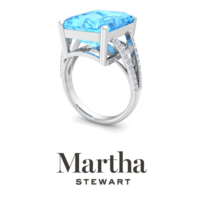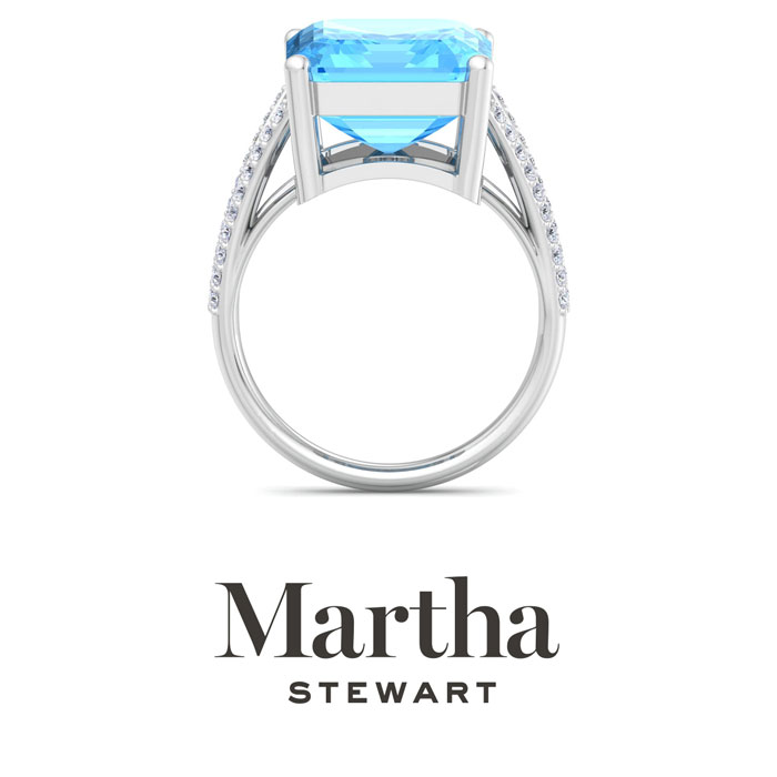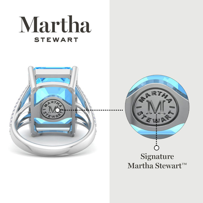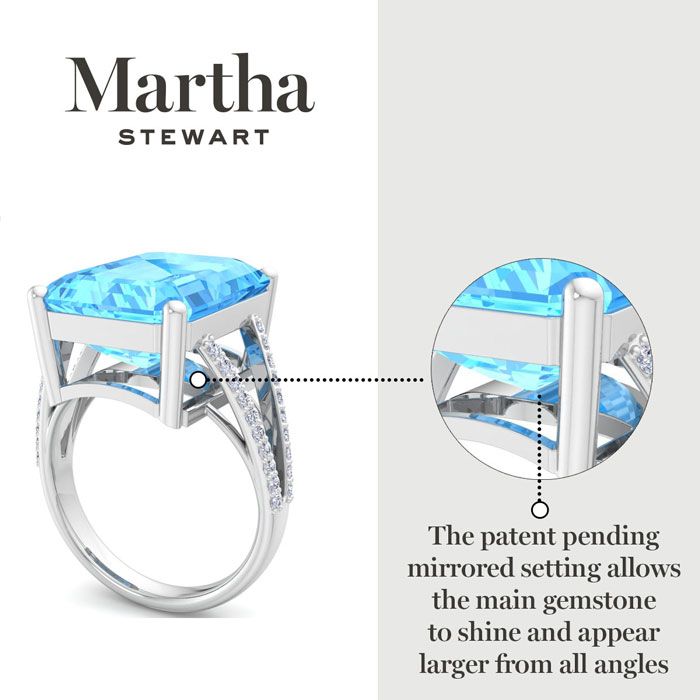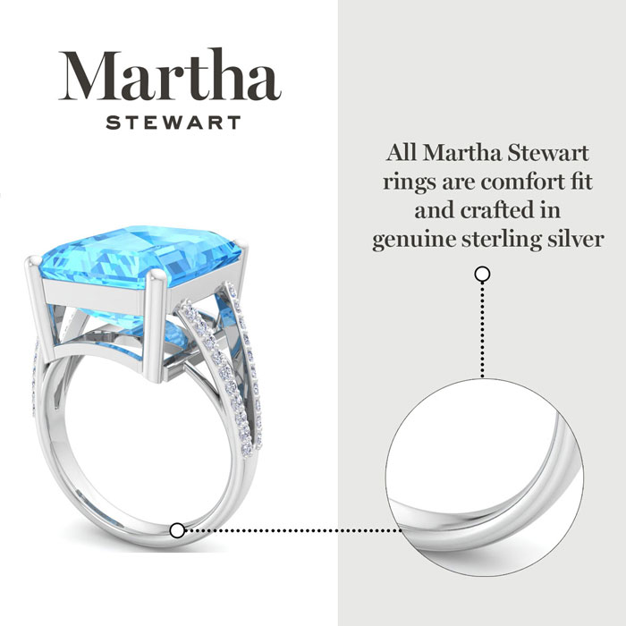 Showcasing class, style and timeless elegance, the Martha Stewart bridge jewelry collection is here to be celebrated. This collection features the finest gemstones and lab grown diamonds set in sterling silver. This Martha Stewart gemstone ring features one 16x12mm emerald cut simulated blue topaz gemstone weighing 10 carats. There are 40 lab grown diamonds in G-H color, VS clarity. Total carat weight is approximately 10 1/4 carats. This ring is beautifully crafted in sterling silver, combining quality with timeless style. Featuring a comfort fit band, the Martha Stewart design ensures both secure and comfortable wear for any occasion. This ring showcases a patent-pending mirrored setting, designed to enhance the color and brilliance of the primary gemstone, making it even more captivating.