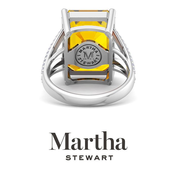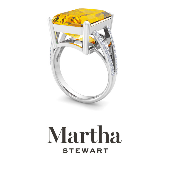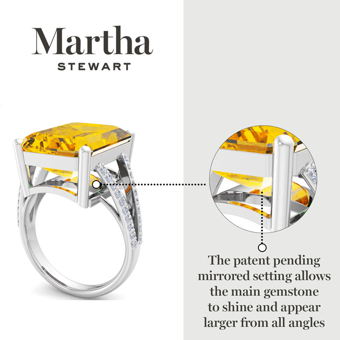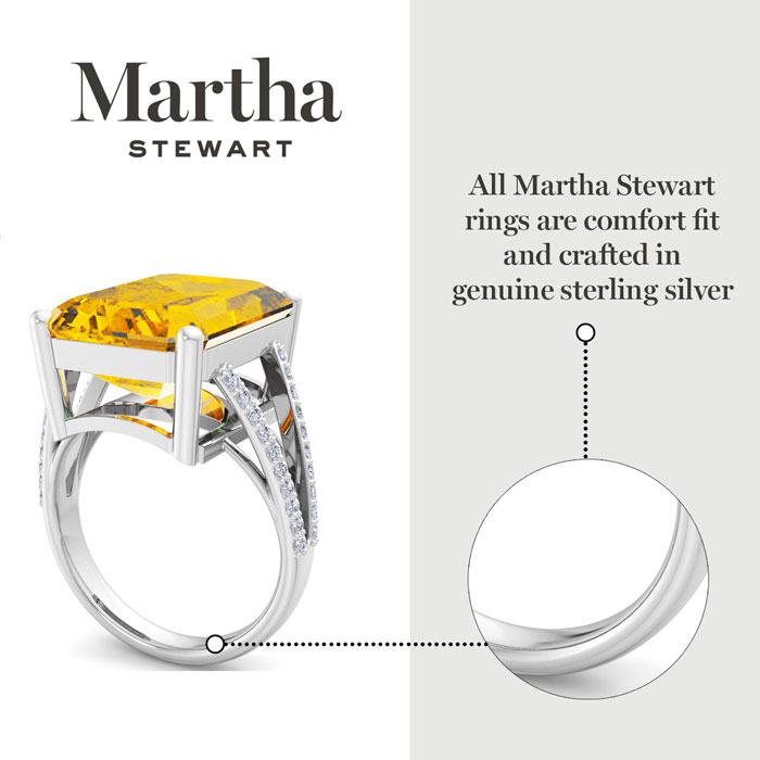 Showcasing class, style and timeless elegance, the Martha Stewart bridge jewelry collection is here to be celebrated. This collection features the finest gemstones and lab grown diamonds set in sterling silver. This Martha Stewart gemstone ring features one 16x12mm emerald cut simulated citrine gemstone weighing 10 carats. There are 40 lab grown diamonds in G-H color, VS clarity. Total carat weight is approximately 10 1/4 carats. This ring is beautifully crafted in sterling silver, combining quality with timeless style. Featuring a comfort fit band, the Martha Stewart design ensures both secure and comfortable wear for any occasion. This ring showcases a patent-pending mirrored setting, designed to enhance the color and brilliance of the primary gemstone, making it even more captivating.