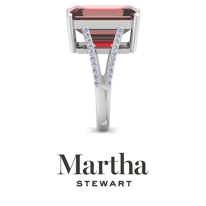 Showcasing class, style and timeless elegance, the Martha Stewart bridge jewelry collection is here to be celebrated. This collection features the finest gemstones and lab grown diamonds set in sterling silver. This Martha Stewart gemstone ring features one 16x12mm emerald cut simulated garnet gemstone weighing 10 carats. There are 40 lab grown diamonds in G-H color, VS clarity. Total carat weight is approximately 10 1/4 carats. This ring is beautifully crafted in sterling silver, combining quality with timeless style. Featuring a comfort fit band, the Martha Stewart design ensures both secure and comfortable wear for any occasion. This ring showcases a patent-pending mirrored setting, designed to enhance the color and brilliance of the primary gemstone, making it even more captivating.