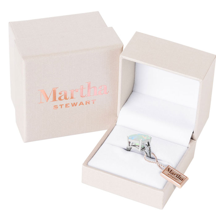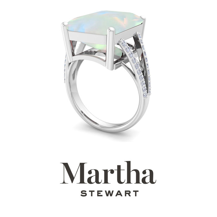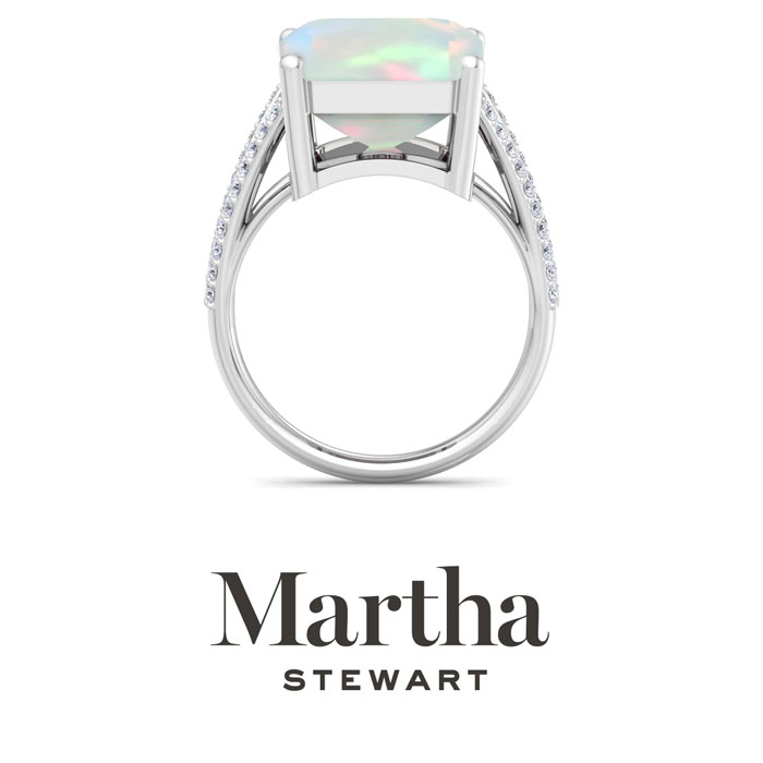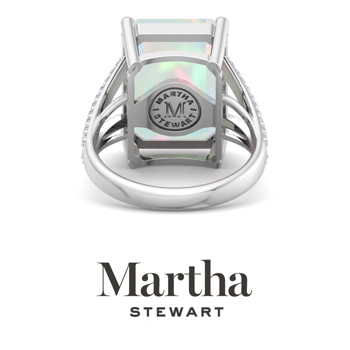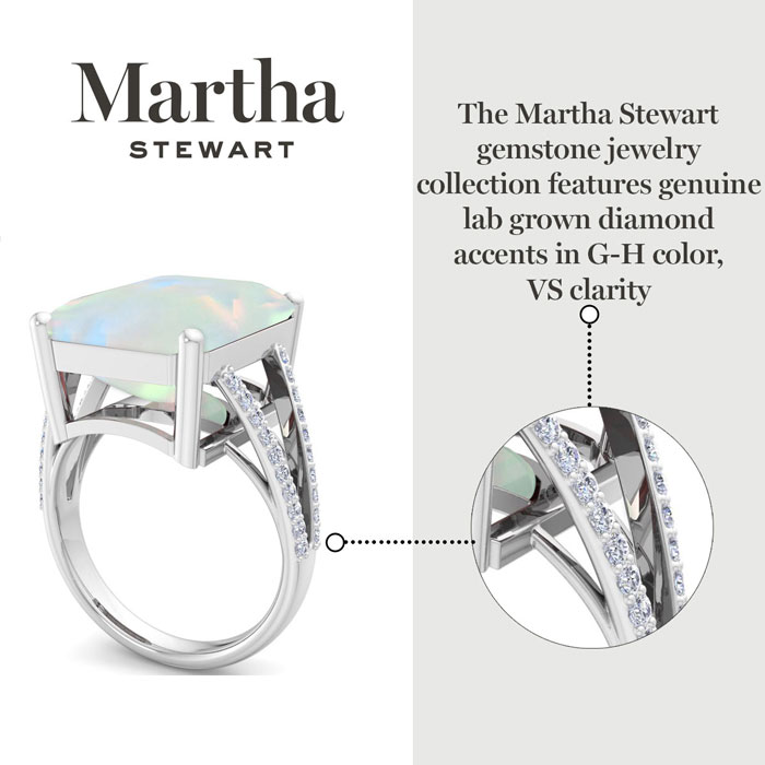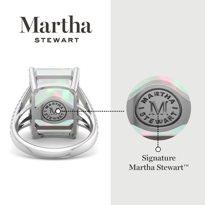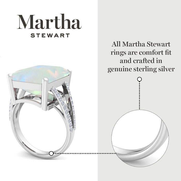 Showcasing class, style and timeless elegance, the Martha Stewart bridge jewelry collection is here to be celebrated. This collection features the finest gemstones and lab grown diamonds set in sterling silver. This Martha Stewart gemstone ring features one 16x12mm emerald cut synthetic opal gemstone weighing 10 carats. There are 40 lab grown diamonds in G-H color, VS clarity. Total carat weight is approximately 10 1/4 carats. This ring is beautifully crafted in sterling silver, combining quality with timeless style. Featuring a comfort fit band, the Martha Stewart design ensures both secure and comfortable wear for any occasion. This ring showcases a patent-pending mirrored setting, designed to enhance the color and brilliance of the primary gemstone, making it even more captivating.
