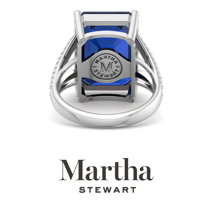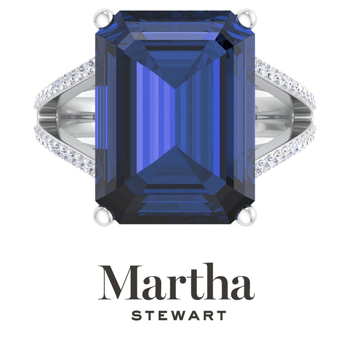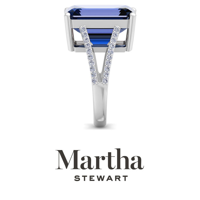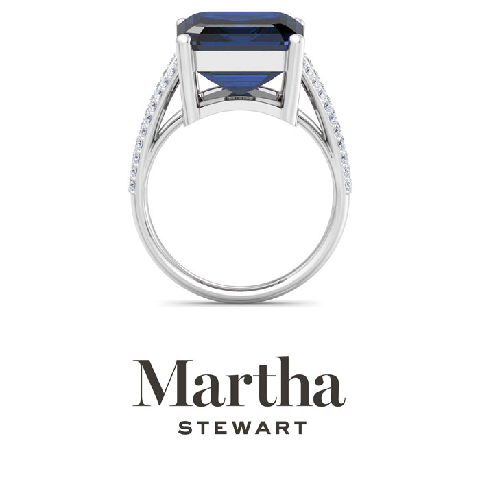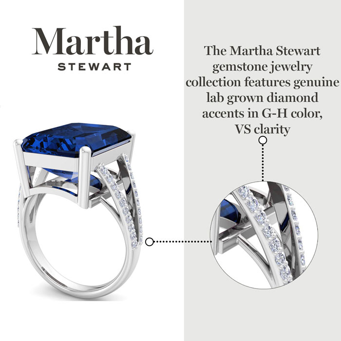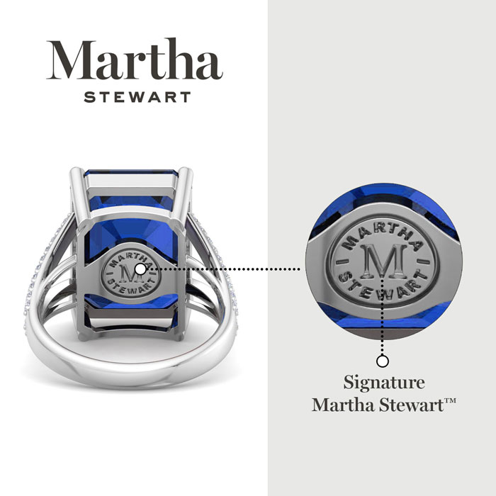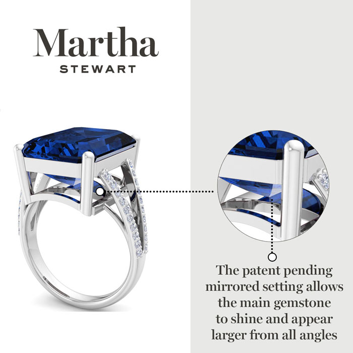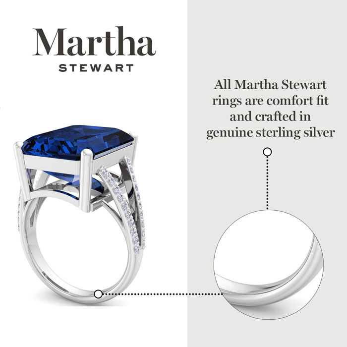 Showcasing class, style and timeless elegance, the Martha Stewart bridge jewelry collection is here to be celebrated. This collection features the finest gemstones and lab grown diamonds set in sterling silver. This Martha Stewart gemstone ring features one 16x12mm emerald cut synthetic sapphire gemstone weighing 10 carats. There are 40 lab grown diamonds in G-H color, VS clarity. Total carat weight is approximately 10 1/4 carats. This ring is beautifully crafted in sterling silver, combining quality with timeless style. Featuring a comfort fit band, the Martha Stewart design ensures both secure and comfortable wear for any occasion. This ring showcases a patent-pending mirrored setting, designed to enhance the color and brilliance of the primary gemstone, making it even more captivating.