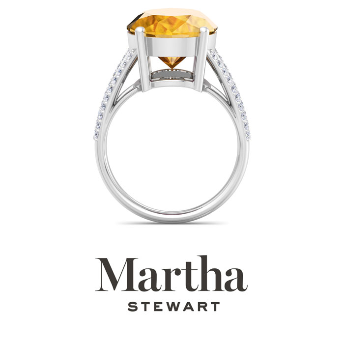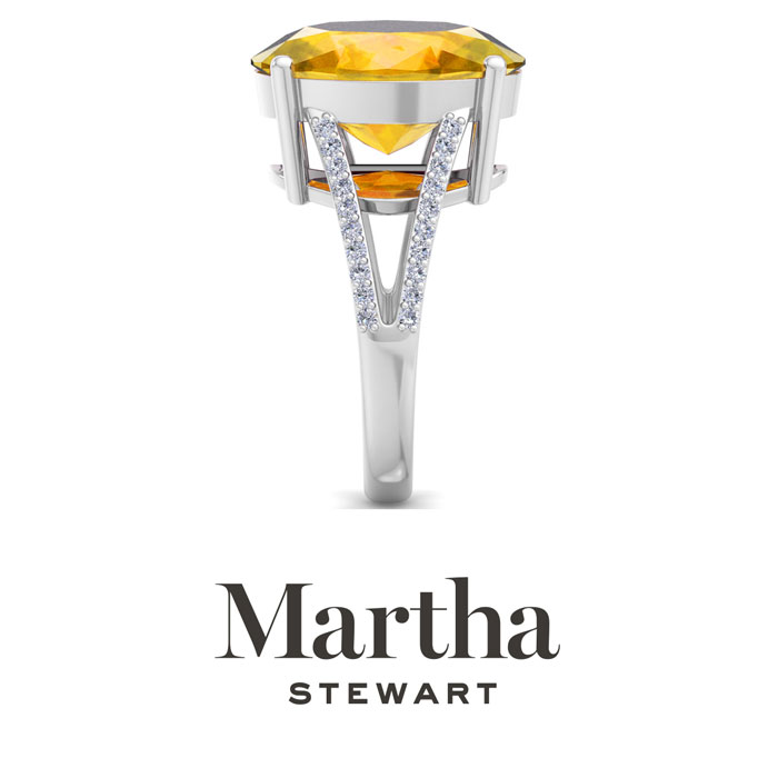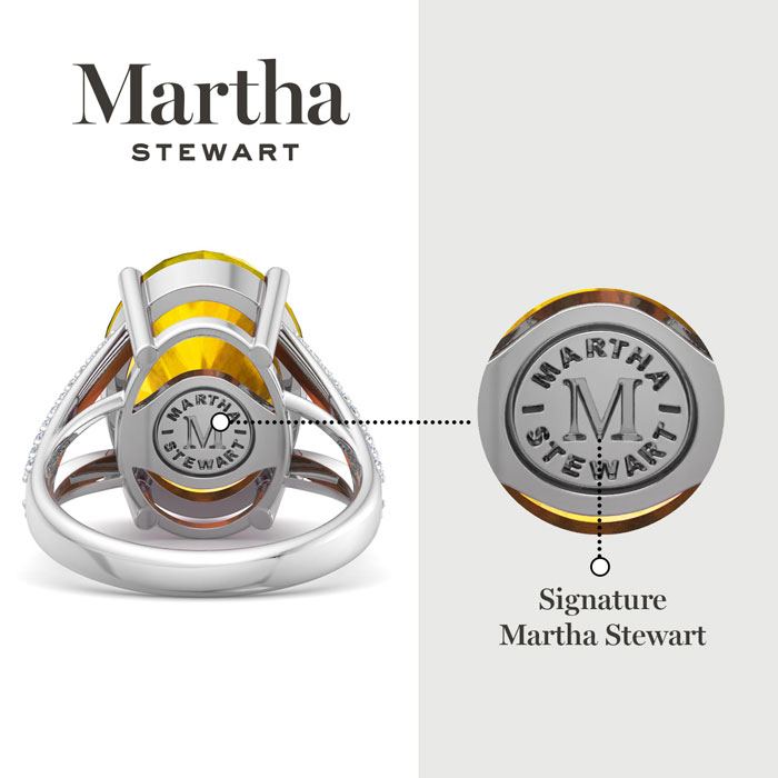 Showcasing class, style and timeless elegance, the Martha Stewart bridge jewelry collection is here to be celebrated. This collection features the finest gemstones and lab grown diamonds set in sterling silver. This Martha Stewart gemstone ring features one 16x12mm oval shape simulated citrine gemstone weighing 10 carats. There are 40 lab grown diamonds in G-H color, VS clarity. Total carat weight is approximately 10 1/4 carats. This ring is beautifully crafted in sterling silver, combining quality with timeless style. Featuring a comfort fit band, the Martha Stewart design ensures both secure and comfortable wear for any occasion. This ring showcases a patent-pending mirrored setting, designed to enhance the color and brilliance of the primary gemstone, making it even more captivating.