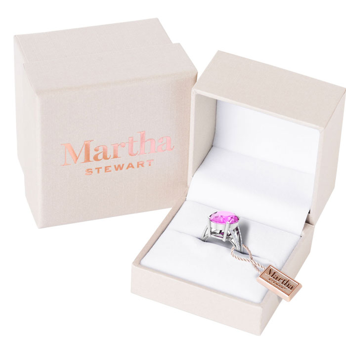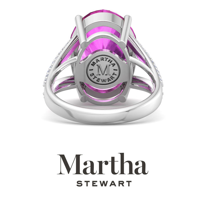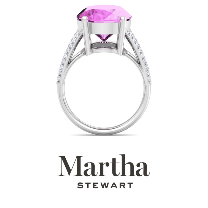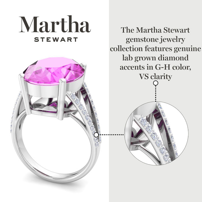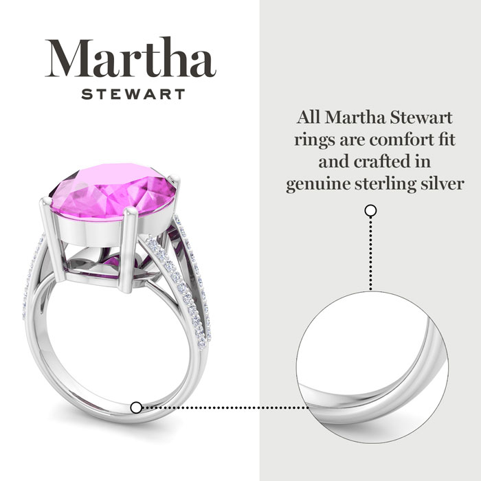 Showcasing class, style and timeless elegance, the Martha Stewart bridge jewelry collection is here to be celebrated. This collection features the finest gemstones and lab grown diamonds set in sterling silver. This Martha Stewart gemstone ring features one 16x12mm oval shape synthetic pink sapphire gemstone weighing 10 carats. There are 40 lab grown diamonds in G-H color, VS clarity. Total carat weight is approximately 10 1/4 carats. This ring is beautifully crafted in sterling silver, combining quality with timeless style. Featuring a comfort fit band, the Martha Stewart design ensures both secure and comfortable wear for any occasion. This ring showcases a patent-pending mirrored setting, designed to enhance the color and brilliance of the primary gemstone, making it even more captivating.