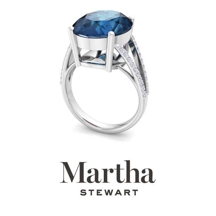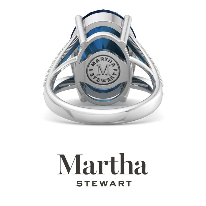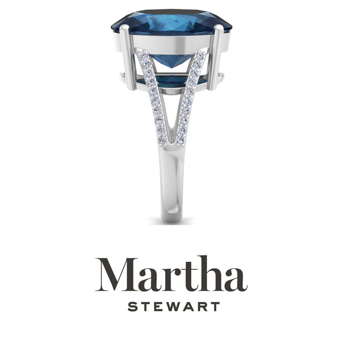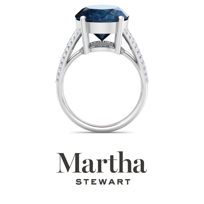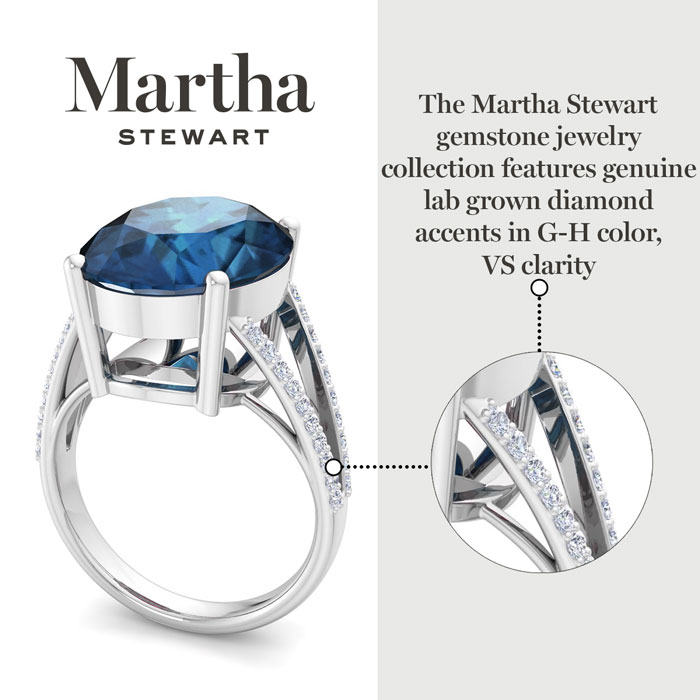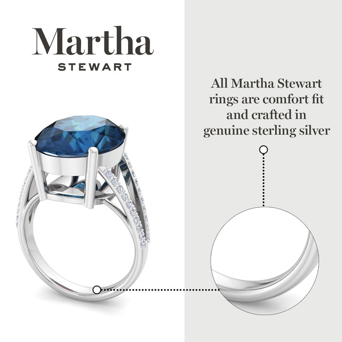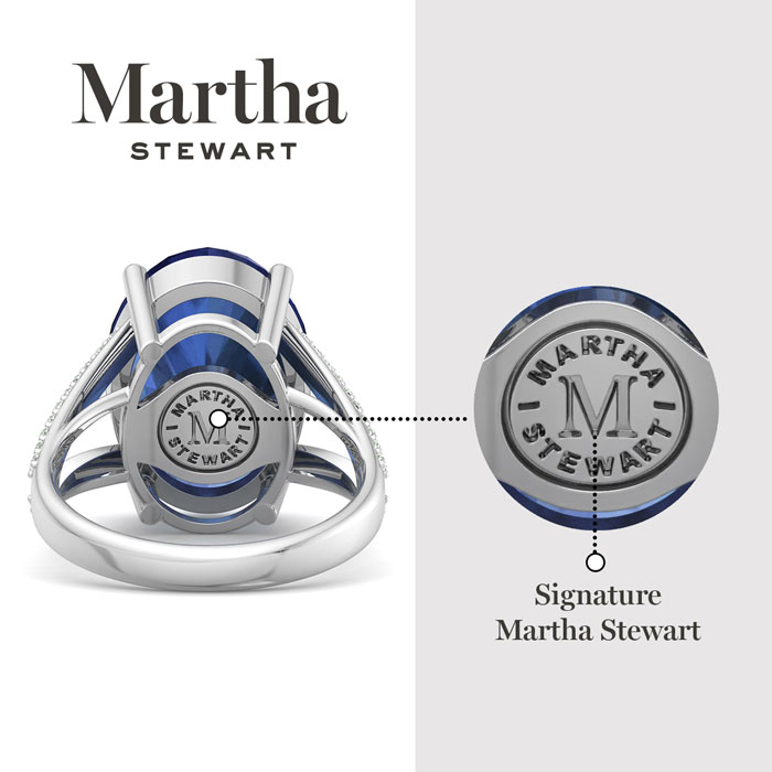 Showcasing class, style and timeless elegance, the Martha Stewart bridge jewelry collection is here to be celebrated. This collection features the finest gemstones and lab grown diamonds set in sterling silver. This Martha Stewart gemstone ring features one 16x12mm oval shape synthetic sapphire gemstone weighing 10 carats. There are 40 lab grown diamonds in G-H color, VS clarity. Total carat weight is approximately 10 1/4 carats. This ring is beautifully crafted in sterling silver, combining quality with timeless style. Featuring a comfort fit band, the Martha Stewart design ensures both secure and comfortable wear for any occasion. This ring showcases a patent-pending mirrored setting, designed to enhance the color and brilliance of the primary gemstone, making it even more captivating.