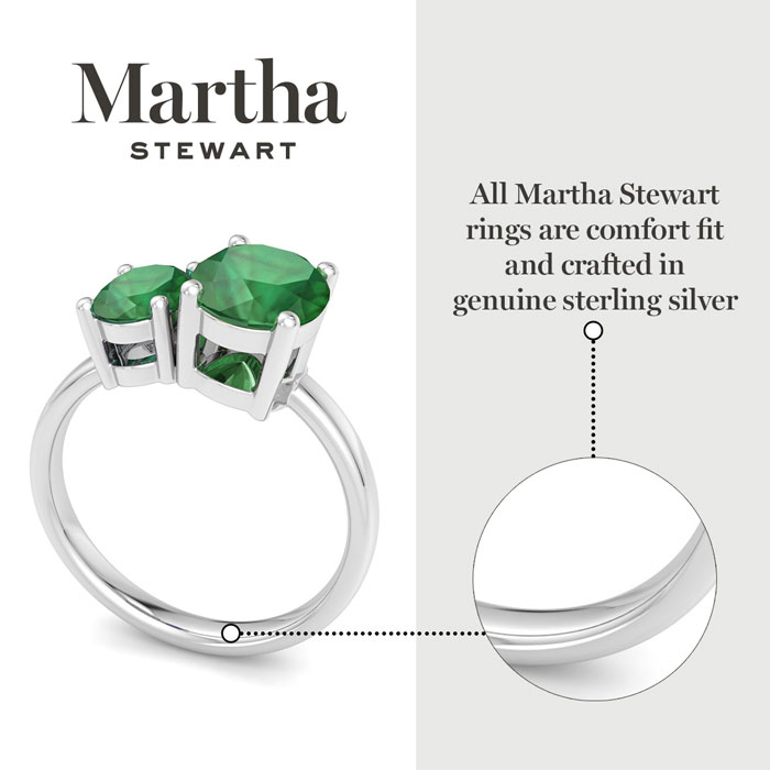 Showcasing class, style and timeless elegance, the Martha Stewart bridge jewelry collection is here to be celebrated. This collection features the finest gemstones and lab grown diamonds set in sterling silver. This Martha Stewart gemstone ring features one 9x7mm oval shape simulated emerald gemstone weighing 1 3/4 carats and one 7x5mm oval shape simulated emerald gemstone weighing 1 carat. Total carat weight is approximately 2 3/4 carats. This ring is beautifully crafted in sterling silver, combining quality with timeless style. Featuring a comfort fit band, the Martha Stewart design ensures both secure and comfortable wear for any occasion. This ring showcases a patent-pending mirrored setting, designed to enhance the color and brilliance of the primary gemstone, making it even more captivating.