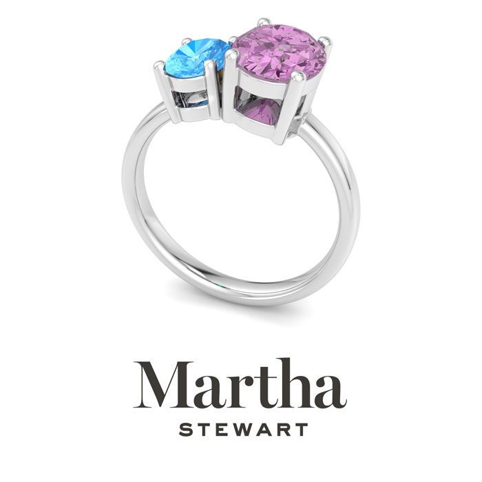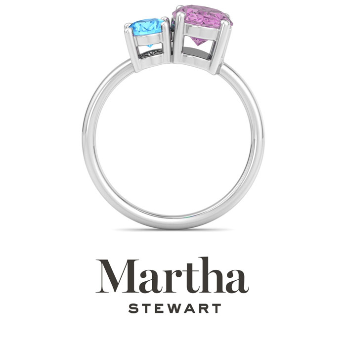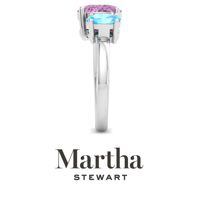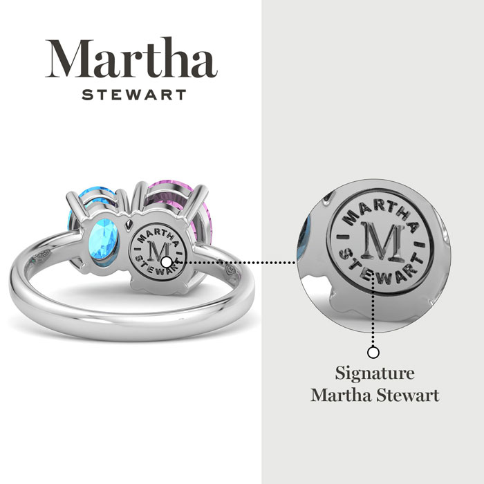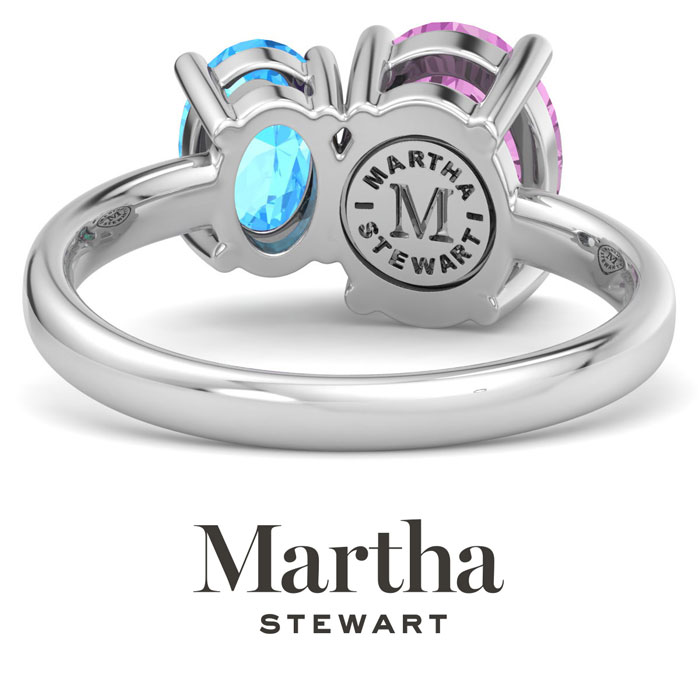 Showcasing class, style and timeless elegance, the Martha Stewart bridge jewelry collection is here to be celebrated. This collection features the finest gemstones and lab grown diamonds set in sterling silver. This Martha Stewart gemstone ring features one 9x7mm oval shape synthetic pink sapphire gemstone weighing 1 3/4 carats and one 7x5mm oval shape simulated blue topaz gemstone weighing 1 carat. Total carat weight is approximately 2 3/4 carats. This ring is beautifully crafted in sterling silver, combining quality with timeless style. Featuring a comfort fit band, the Martha Stewart design ensures both secure and comfortable wear for any occasion. This ring showcases a patent-pending mirrored setting, designed to enhance the color and brilliance of the primary gemstone, making it even more captivating.