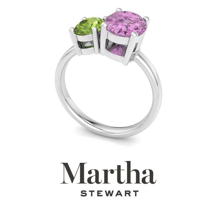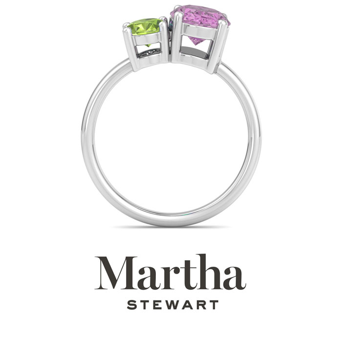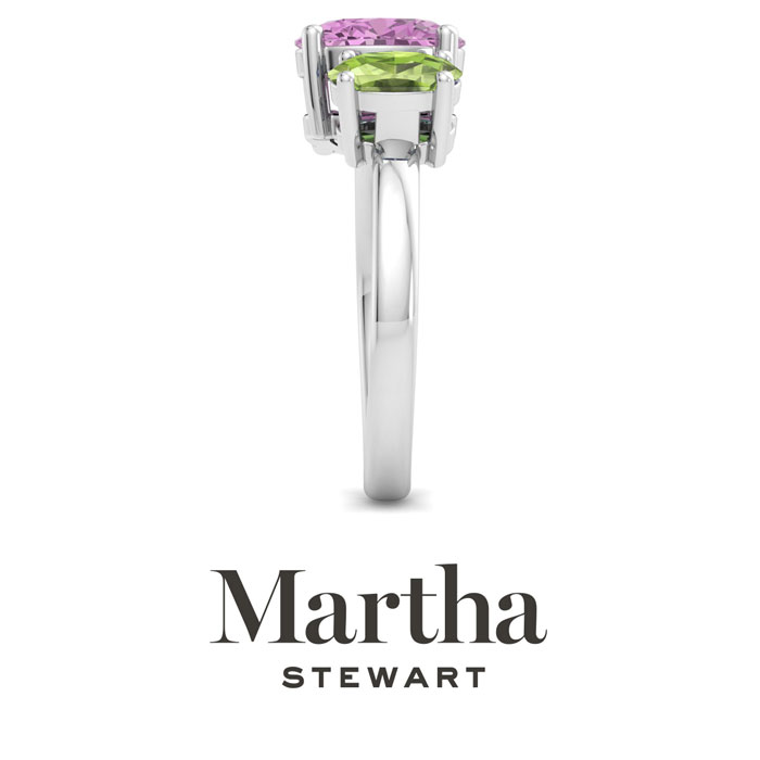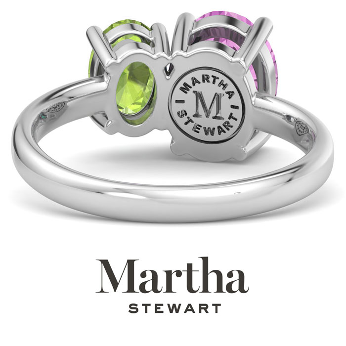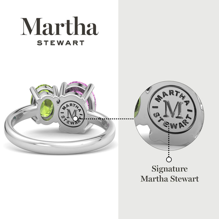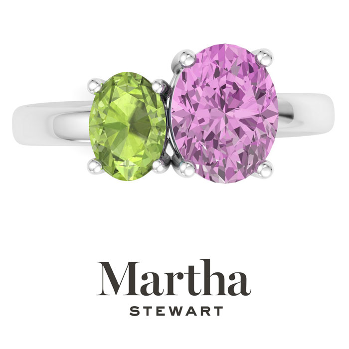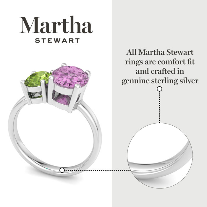 Showcasing class, style and timeless elegance, the Martha Stewart bridge jewelry collection is here to be celebrated. This collection features the finest gemstones and lab grown diamonds set in sterling silver. This Martha Stewart gemstone ring features one 9x7mm oval shape synthetic pink sapphire gemstone weighing 1 3/4 carats and one 7x5mm oval shape simulated peridot gemstone weighing 1 carat. Total carat weight is approximately 2 3/4 carats. This ring is beautifully crafted in sterling silver, combining quality with timeless style. Featuring a comfort fit band, the Martha Stewart design ensures both secure and comfortable wear for any occasion. This ring showcases a patent-pending mirrored setting, designed to enhance the color and brilliance of the primary gemstone, making it even more captivating.
