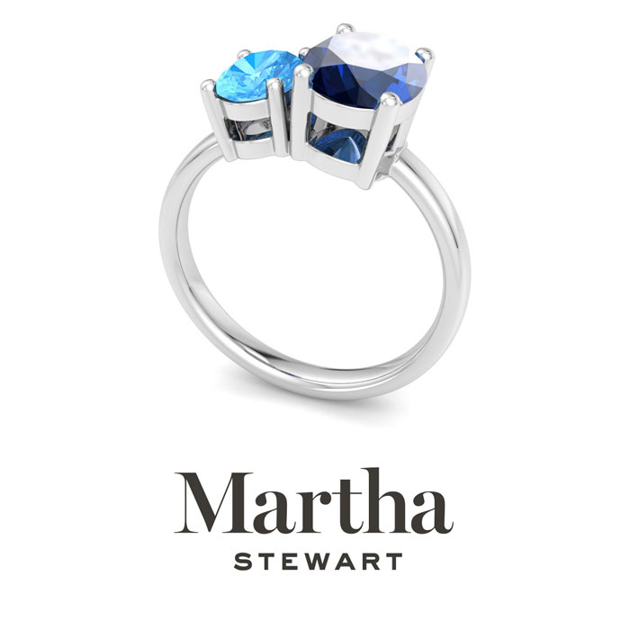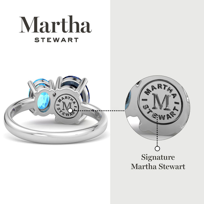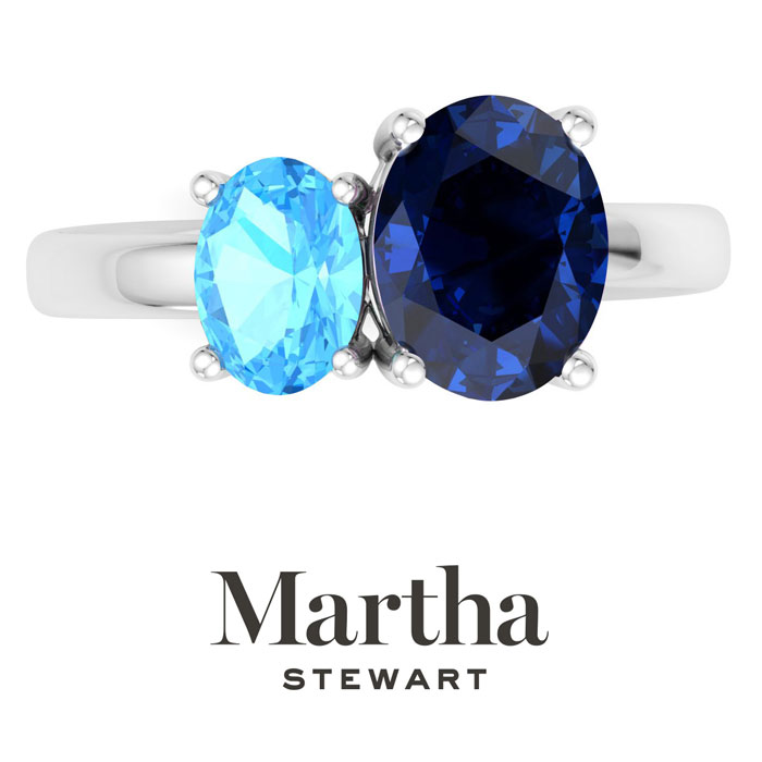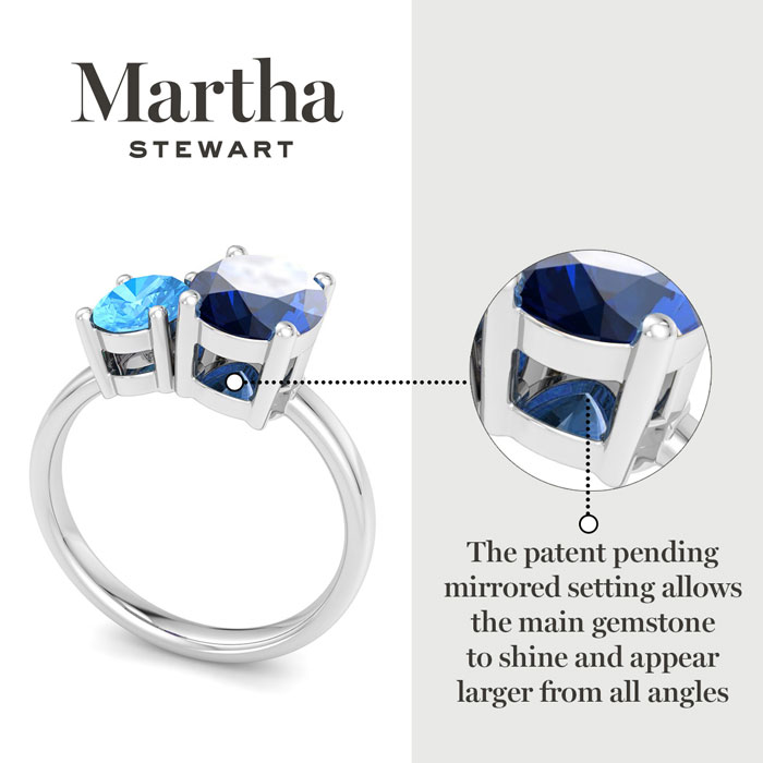Showcasing class, style and timeless elegance, the Martha Stewart bridge jewelry collection is here to be celebrated. This collection features the finest gemstones and lab grown diamonds set in sterling silver. This Martha Stewart gemstone ring features one 9x7mm oval shape synthetic sapphire gemstone weighing 1 3/4 carats and one 7x5mm oval shape simulated blue topaz gemstone weighing 1 carat. Total carat weight is approximately 2 3/4 carats. This ring is beautifully crafted in sterling silver, combining quality with timeless style. Featuring a comfort fit band, the Martha Stewart design ensures both secure and comfortable wear for any occasion. This ring showcases a patent-pending mirrored setting, designed to enhance the color and brilliance of the primary gemstone, making it even more captivating.