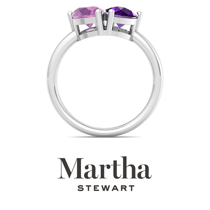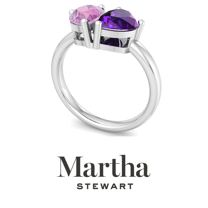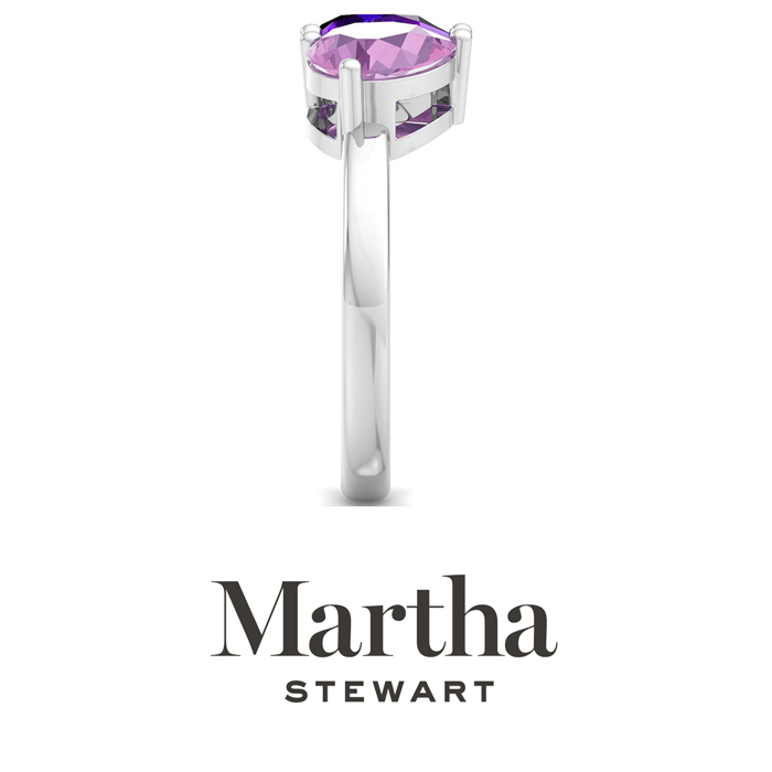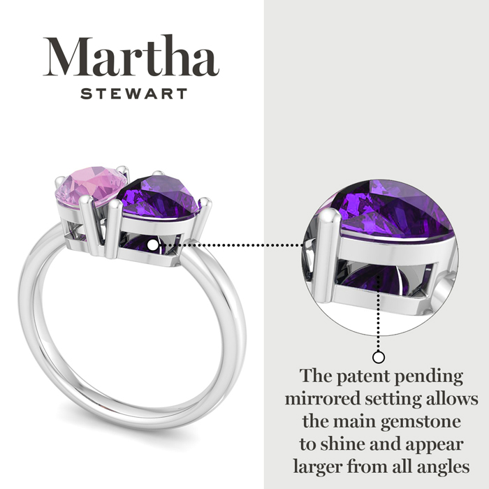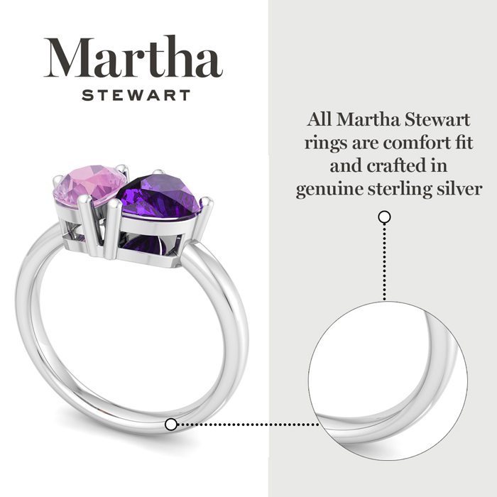 Showcasing class, style and timeless elegance, the Martha Stewart bridge jewelry collection is here to be celebrated. This collection features the finest gemstones and lab grown diamonds set in sterling silver. This Martha Stewart gemstone ring features one 8x6mm pear shape synthetic pink sapphire gemstone weighing 1 carat and one 8x6mm pear shape synthetic amethyst gemstone weighing 1 carat. Total carat weight is approximately 2 carats. This ring is beautifully crafted in sterling silver, combining quality with timeless style. Featuring a comfort fit band, the Martha Stewart design ensures both secure and comfortable wear for any occasion. This ring showcases a patent-pending mirrored setting, designed to enhance the color and brilliance of the primary gemstone, making it even more captivating.