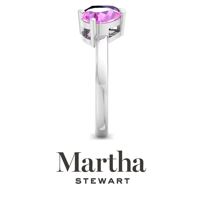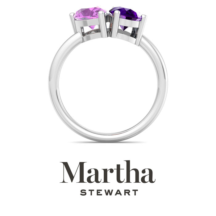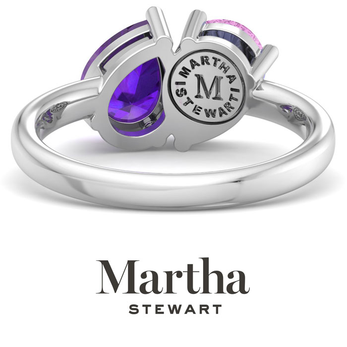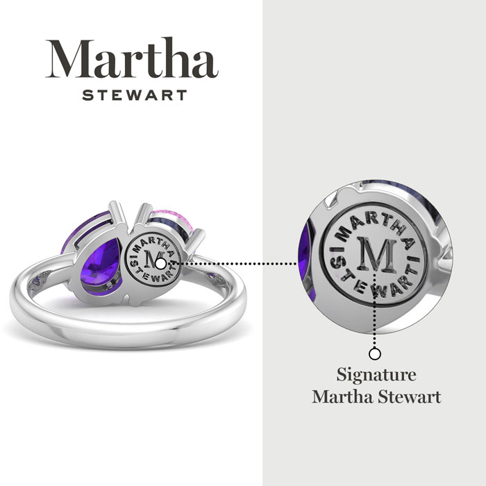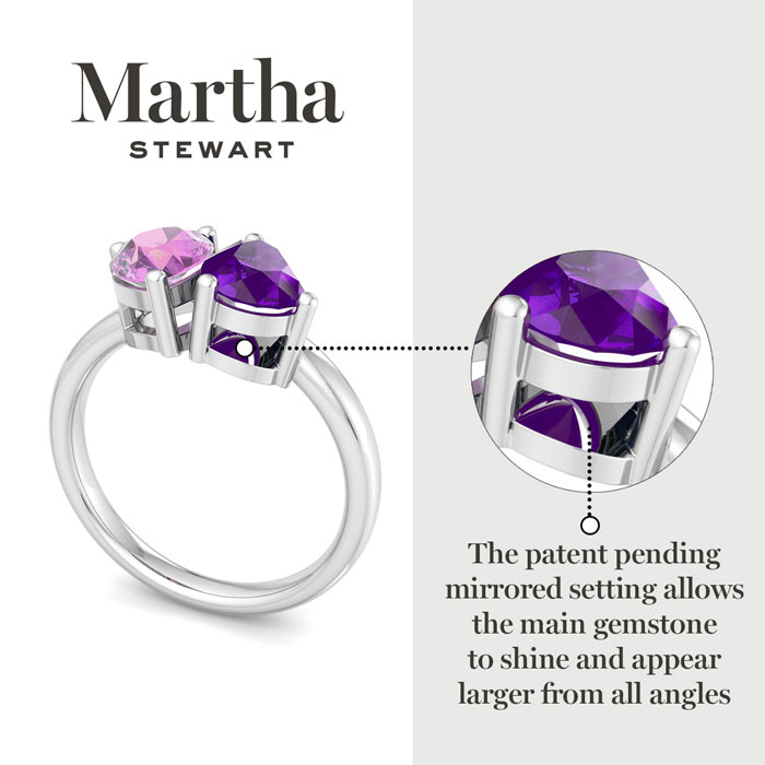 Showcasing class, style and timeless elegance, the Martha Stewart bridge jewelry collection is here to be celebrated. This collection features the finest gemstones and lab grown diamonds set in sterling silver. This Martha Stewart gemstone ring features one 8x6mm pear shape synthetic pink sapphire gemstone weighing 1 carat and one 8x6mm pear shape synthetic amethyst gemstone weighing 1 carat. Total carat weight is approximately 2 carats. This ring is beautifully crafted in sterling silver, combining quality with timeless style. Featuring a comfort fit band, the Martha Stewart design ensures both secure and comfortable wear for any occasion. This ring showcases a patent-pending mirrored setting, designed to enhance the color and brilliance of the primary gemstone, making it even more captivating.
