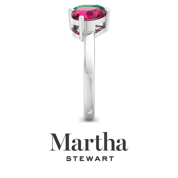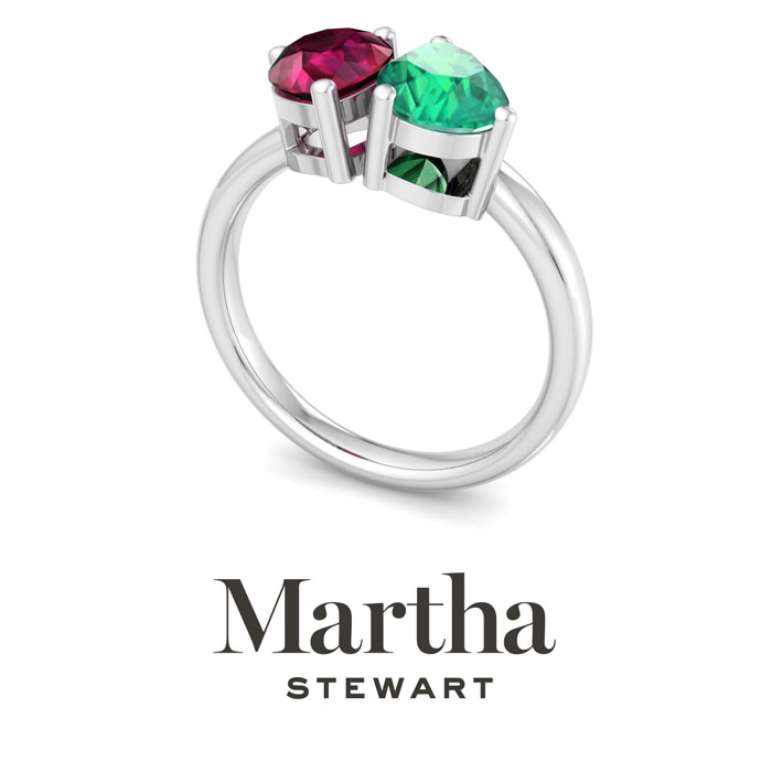 Showcasing class, style and timeless elegance, the Martha Stewart bridge jewelry collection is here to be celebrated. This collection features the finest gemstones and lab grown diamonds set in sterling silver. This Martha Stewart gemstone ring features one 8x6mm pear shape synthetic ruby gemstone weighing 1 carat and one 8x6mm pear shape simulated emerald gemstone weighing 1 carat. Total carat weight is approximately 2 carats. This ring is beautifully crafted in sterling silver, combining quality with timeless style. Featuring a comfort fit band, the Martha Stewart design ensures both secure and comfortable wear for any occasion. This ring showcases a patent-pending mirrored setting, designed to enhance the color and brilliance of the primary gemstone, making it even more captivating.
