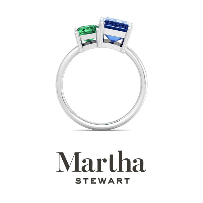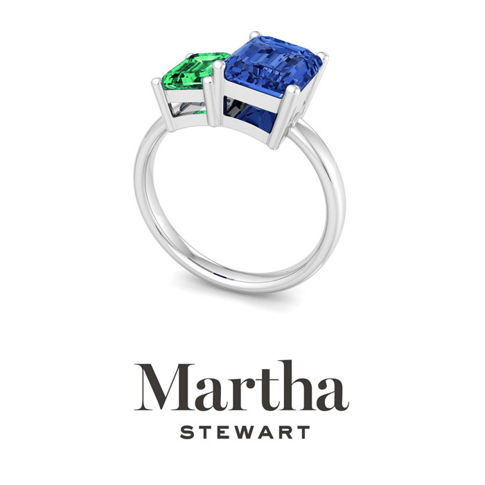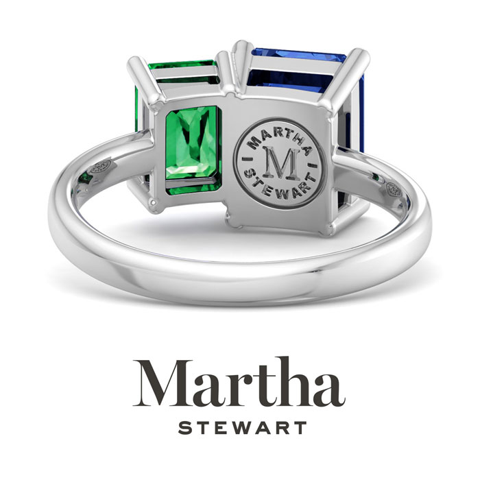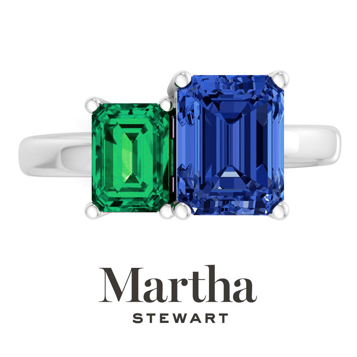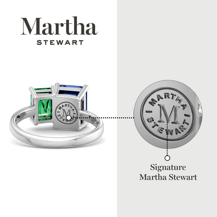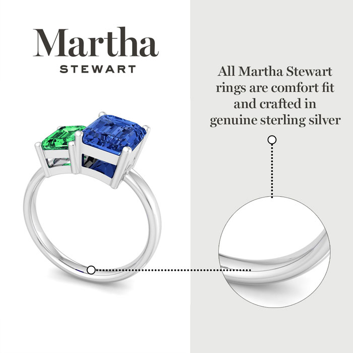 Showcasing class, style and timeless elegance, the Martha Stewart bridge jewelry collection is here to be celebrated. This collection features the finest gemstones and lab grown diamonds set in sterling silver. This Martha Stewart gemstone ring features one 9x7mm emerald cut synthetic sapphire gemstone weighing 2 1/4 carats and one 7x5mm emerald cut simulated emerald gemstone weighing 1 carat. Total carat weight is approximately 3 1/4 carats. This ring is beautifully crafted in sterling silver, combining quality with timeless style. Featuring a comfort fit band, the Martha Stewart design ensures both secure and comfortable wear for any occasion. This ring showcases a patent-pending mirrored setting, designed to enhance the color and brilliance of the primary gemstone, making it even more captivating.