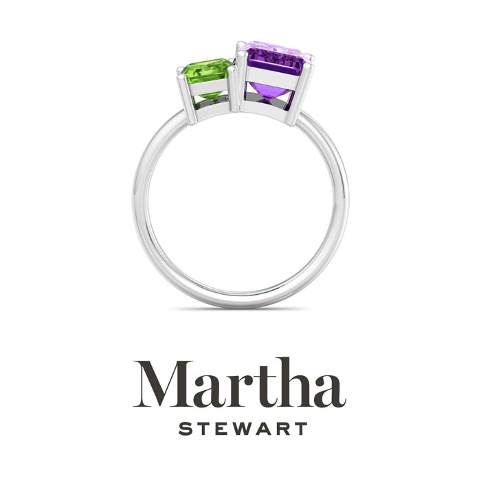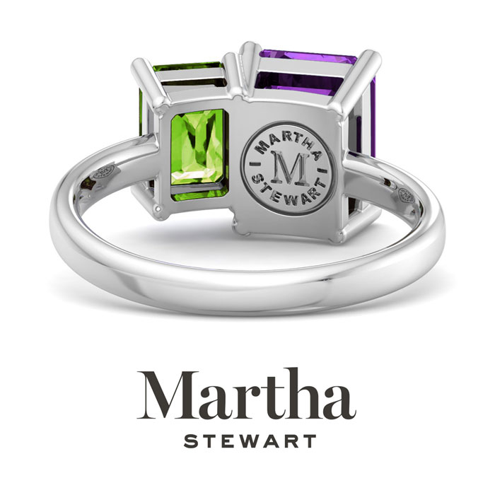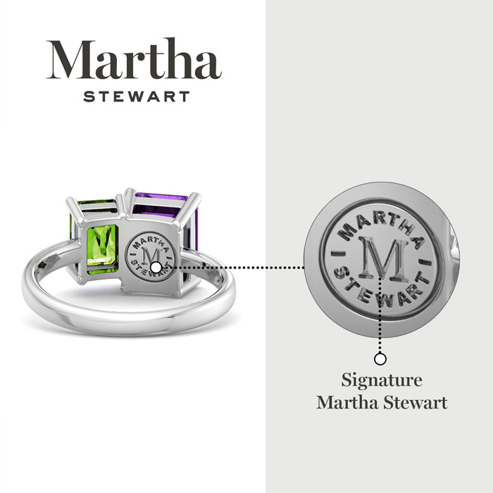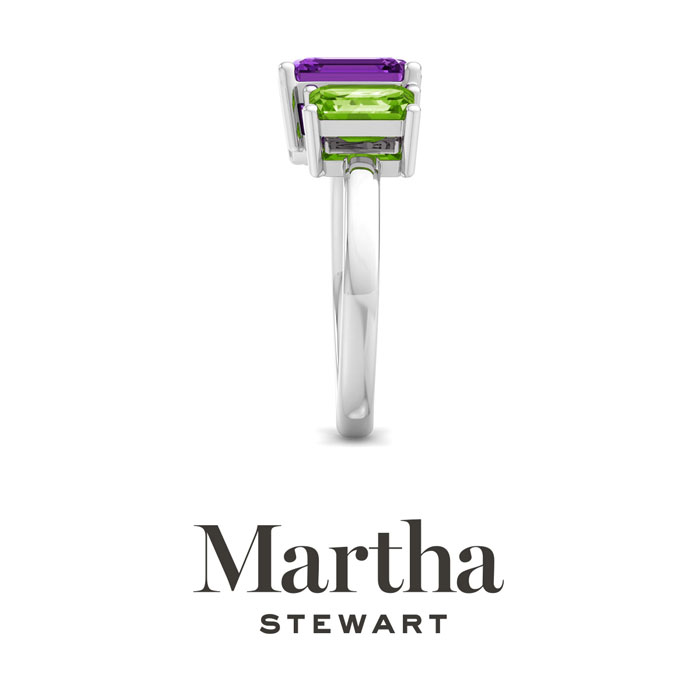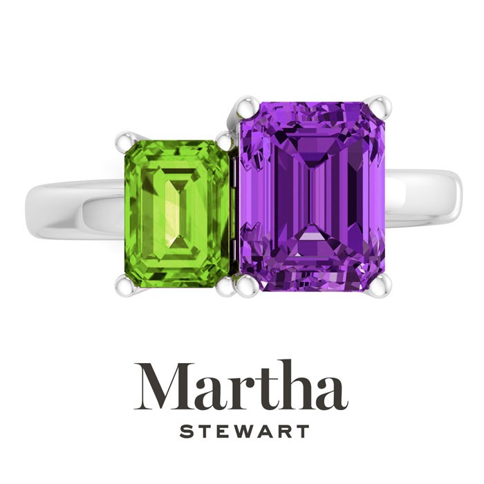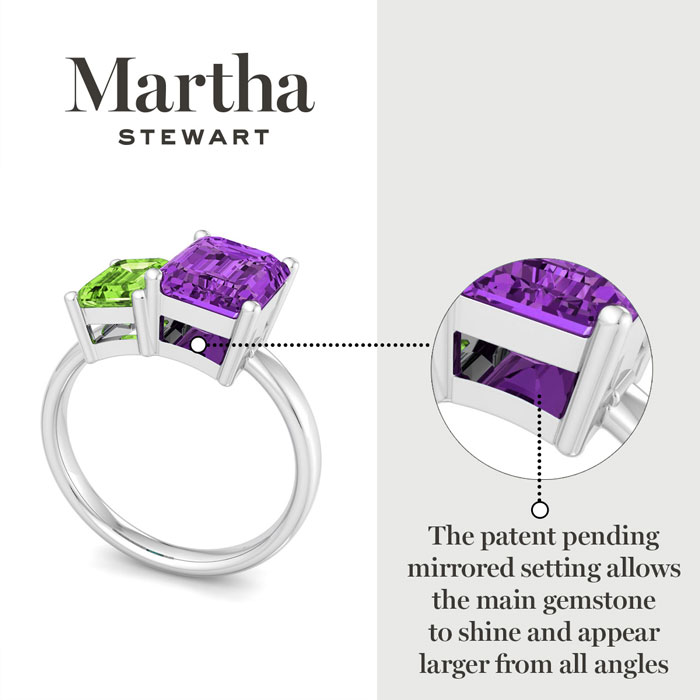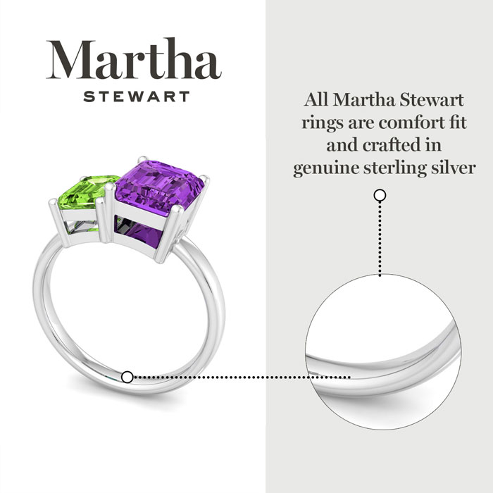 Showcasing class, style and timeless elegance, the Martha Stewart bridge jewelry collection is here to be celebrated. This collection features the finest gemstones and lab grown diamonds set in sterling silver. This Martha Stewart gemstone ring features one 9x7mm emerald cut synthetic amethyst gemstone weighing 2 1/4 carats and one 7x5mm emerald cut simulated peridot gemstone weighing 1 carat. Total carat weight is approximately 3 1/4 carats. This ring is beautifully crafted in sterling silver, combining quality with timeless style. Featuring a comfort fit band, the Martha Stewart design ensures both secure and comfortable wear for any occasion. This ring showcases a patent-pending mirrored setting, designed to enhance the color and brilliance of the primary gemstone, making it even more captivating.