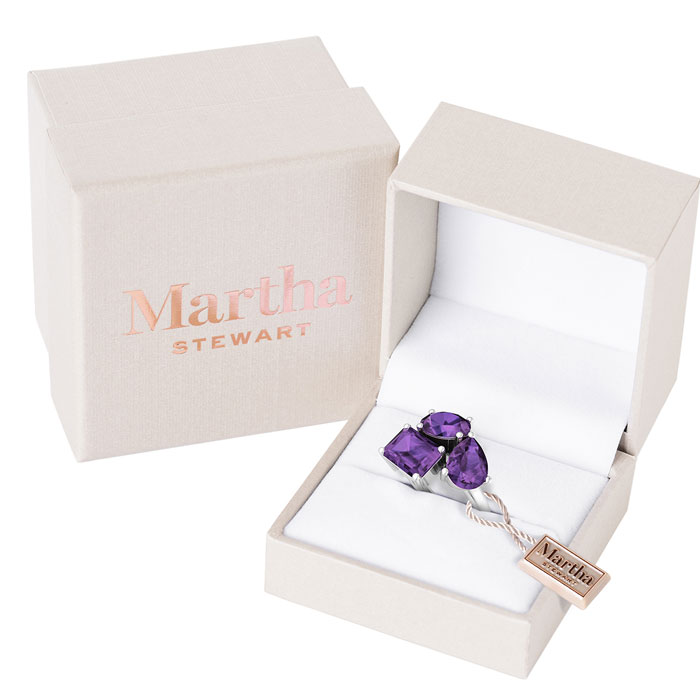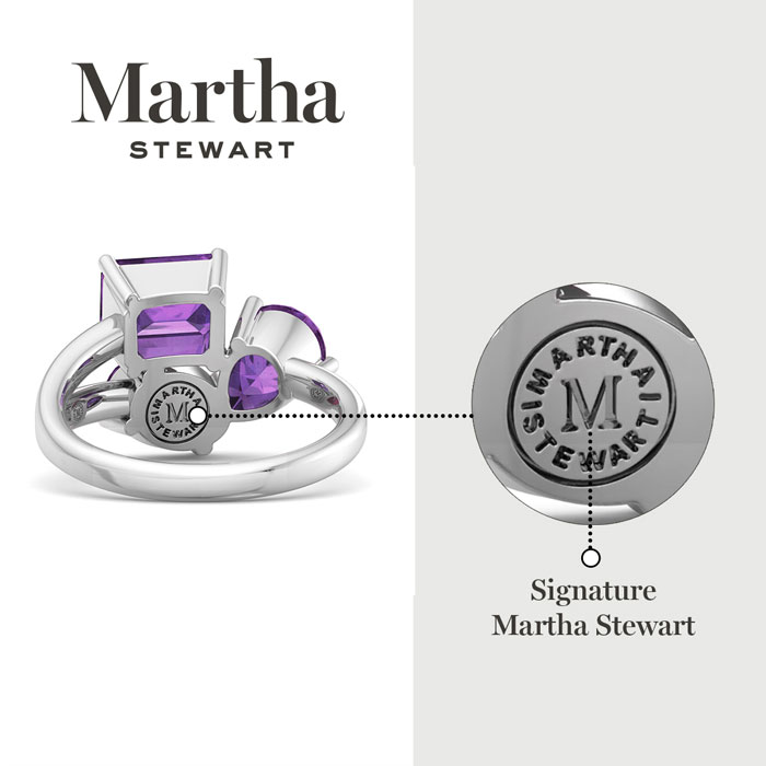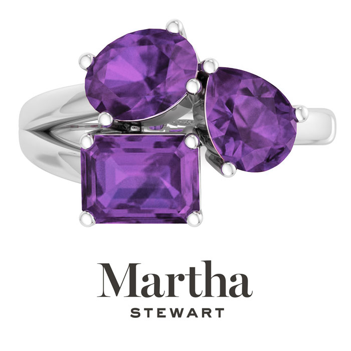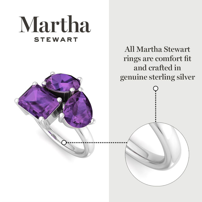 Showcasing class, style and timeless elegance, the Martha Stewart bridge jewelry collection is here to be celebrated. This collection features the finest gemstones and lab grown diamonds set in sterling silver. This Martha Stewart gemstone ring features one 8x6mm oval shape synthetic amethyst gemstone weighing 1 1/4 carats, one 8x6mm pear shape synthetic amethyst gemstone weighing 1 carat and one 8x6mm emerald cut synthetic amethyst gemstone weighing 1 1/2 carats. Total carat weight is approximately 3 3/4 carats. This ring is beautifully crafted in sterling silver, combining quality with timeless style. Featuring a comfort fit band, the Martha Stewart design ensures both secure and comfortable wear for any occasion.