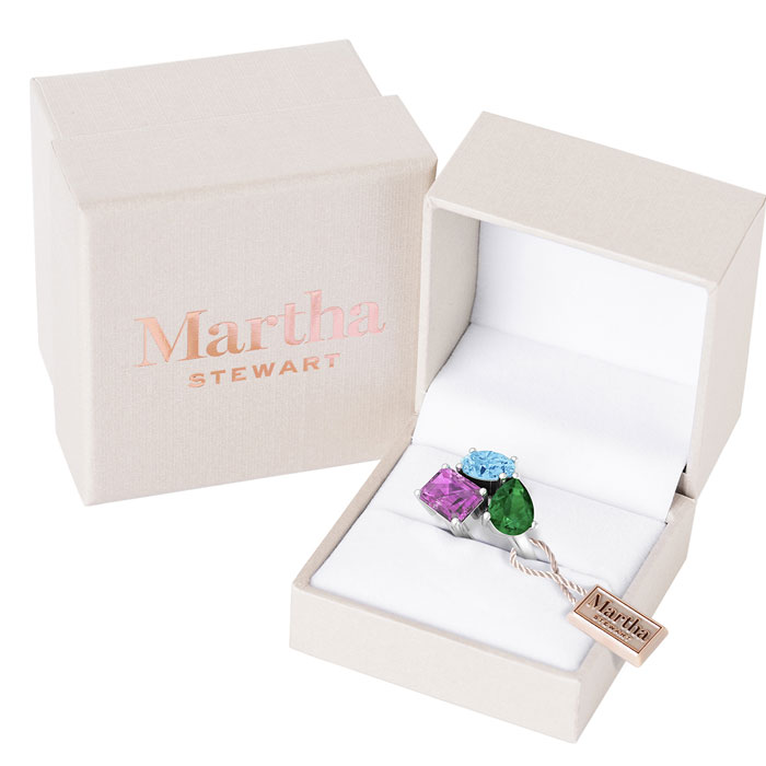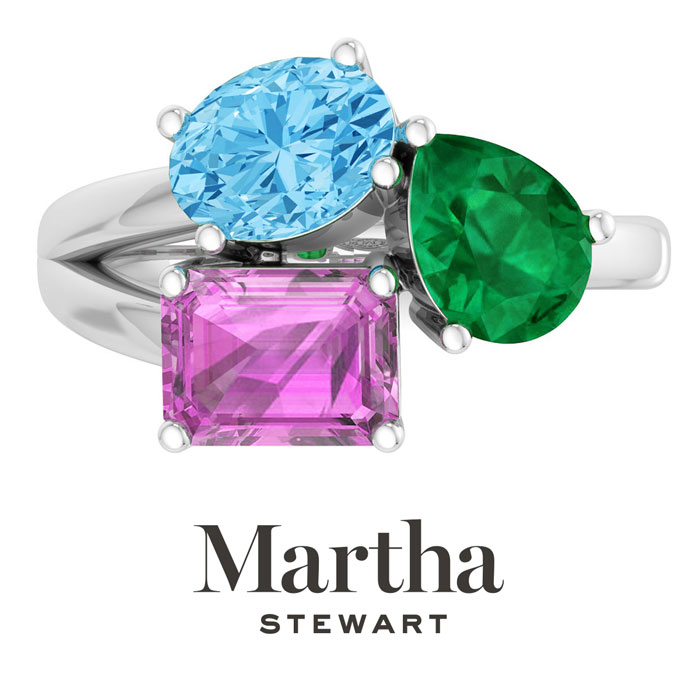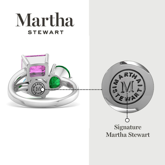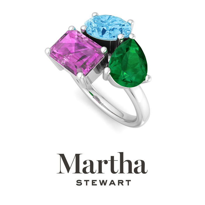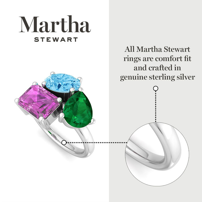 Showcasing class, style and timeless elegance, the Martha Stewart bridge jewelry collection is here to be celebrated. This collection features the finest gemstones and lab grown diamonds set in sterling silver. This Martha Stewart gemstone ring features one 8x6mm oval shape simulated blue topaz gemstone weighing 1 1/4 carats, one 8x6mm pear shape simulated emerald gemstone weighing 1 carat and one 8x6mm emerald cut synthetic pink sapphire gemstone weighing 1 1/2 carats. Total carat weight is approximately 3 3/4 carats. This ring is beautifully crafted in sterling silver, combining quality with timeless style. Featuring a comfort fit band, the Martha Stewart design ensures both secure and comfortable wear for any occasion.