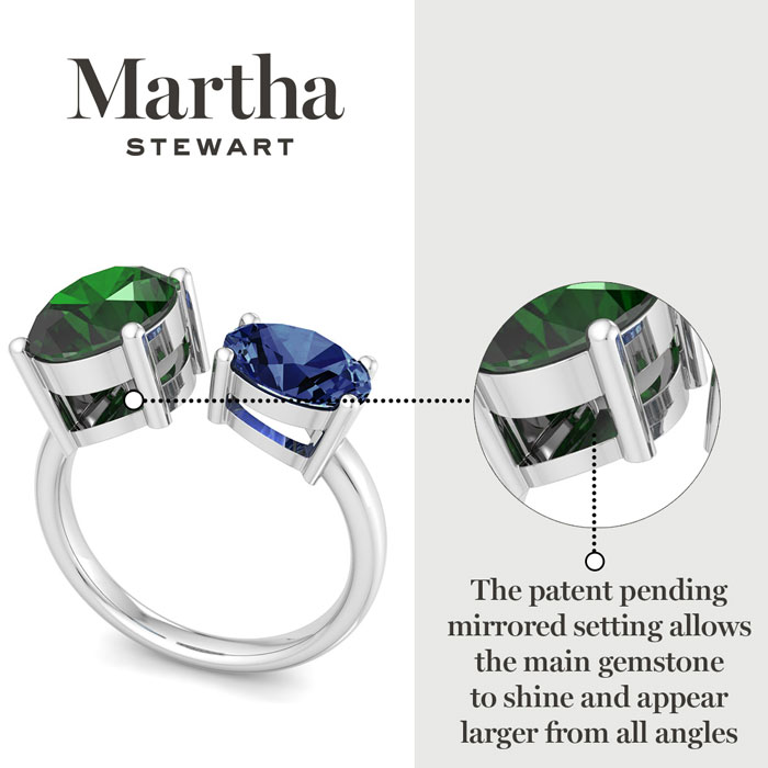 Showcasing class, style and timeless elegance, the Martha Stewart bridge jewelry collection is here to be celebrated. This collection features the finest gemstones and lab grown diamonds set in sterling silver. This Martha Stewart gemstone ring features one 10x8mm oval shape simulated emerald gemstone weighing 2 1/2 carats and one 8x6mm oval shape synthetic sapphire gemstone weighing 1 1/4 carats. Total carat weight is approximately 3 3/4 carats. This ring is beautifully crafted in sterling silver, combining quality with timeless style. Featuring a comfort fit band, the Martha Stewart design ensures both secure and comfortable wear for any occasion. This ring showcases a patent-pending mirrored setting, designed to enhance the color and brilliance of the primary gemstone, making it even more captivating.
