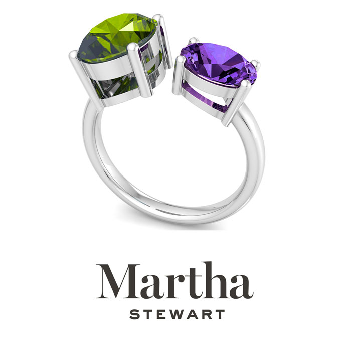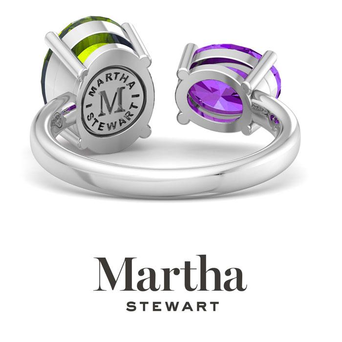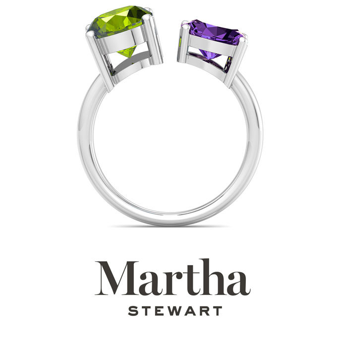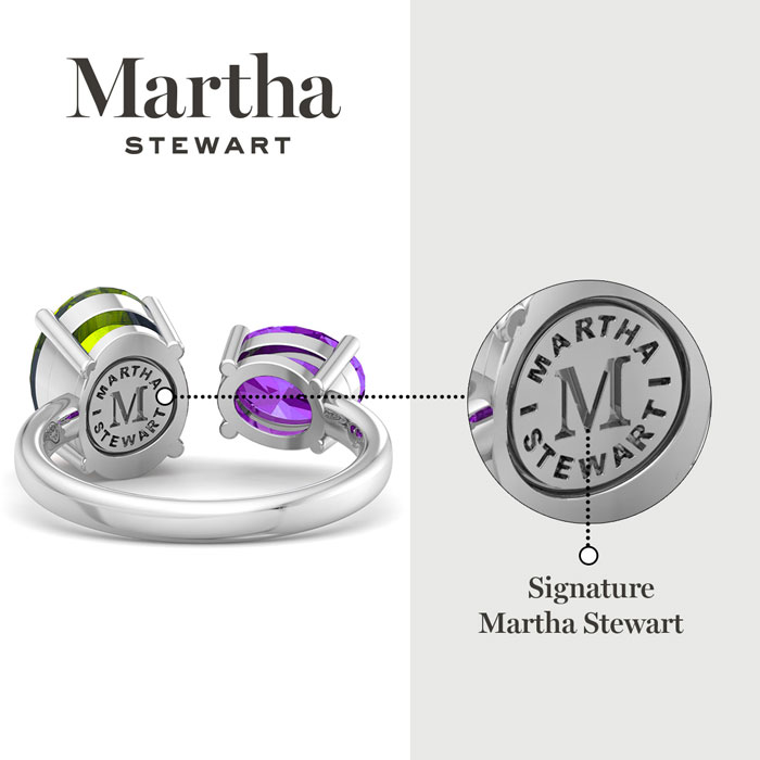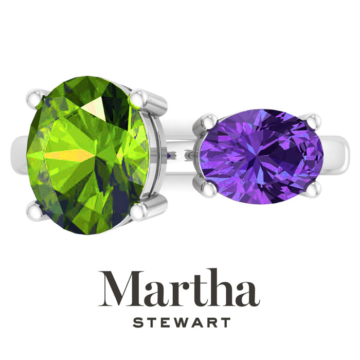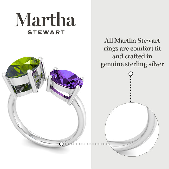 Showcasing class, style and timeless elegance, the Martha Stewart bridge jewelry collection is here to be celebrated. This collection features the finest gemstones and lab grown diamonds set in sterling silver. This Martha Stewart gemstone ring features one 10x8mm oval shape simulated peridot gemstone weighing 2 1/2 carats and one 8x6mm oval shape synthetic amethyst gemstone weighing 1 1/4 carats. Total carat weight is approximately 3 3/4 carats. This ring is beautifully crafted in sterling silver, combining quality with timeless style. Featuring a comfort fit band, the Martha Stewart design ensures both secure and comfortable wear for any occasion. This ring showcases a patent-pending mirrored setting, designed to enhance the color and brilliance of the primary gemstone, making it even more captivating.