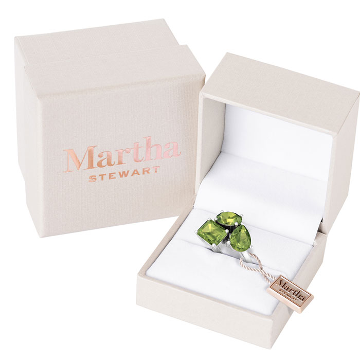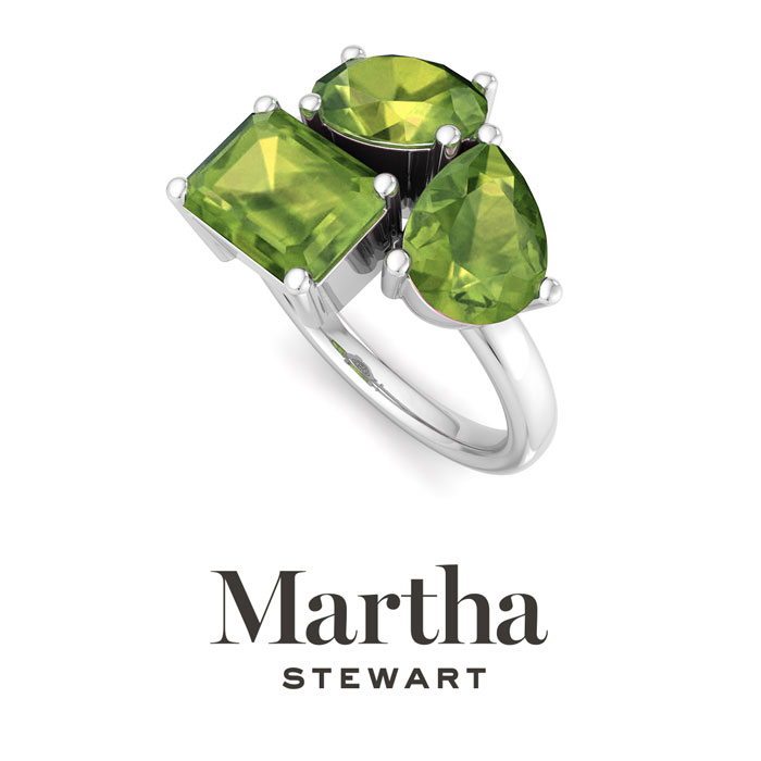 Showcasing class, style and timeless elegance, the Martha Stewart bridge jewelry collection is here to be celebrated. This collection features the finest gemstones and lab grown diamonds set in sterling silver. This Martha Stewart gemstone ring features one 8x6mm oval shape simulated peridot gemstone weighing 1 1/4 carats, one 8x6mm pear shape simulated peridot gemstone weighing 1 carat and one 8x6mm emerald cut simulated peridot gemstone weighing 1 1/2 carats. Total carat weight is approximately 3 3/4 carats. This ring is beautifully crafted in sterling silver, combining quality with timeless style. Featuring a comfort fit band, the Martha Stewart design ensures both secure and comfortable wear for any occasion.