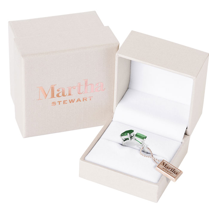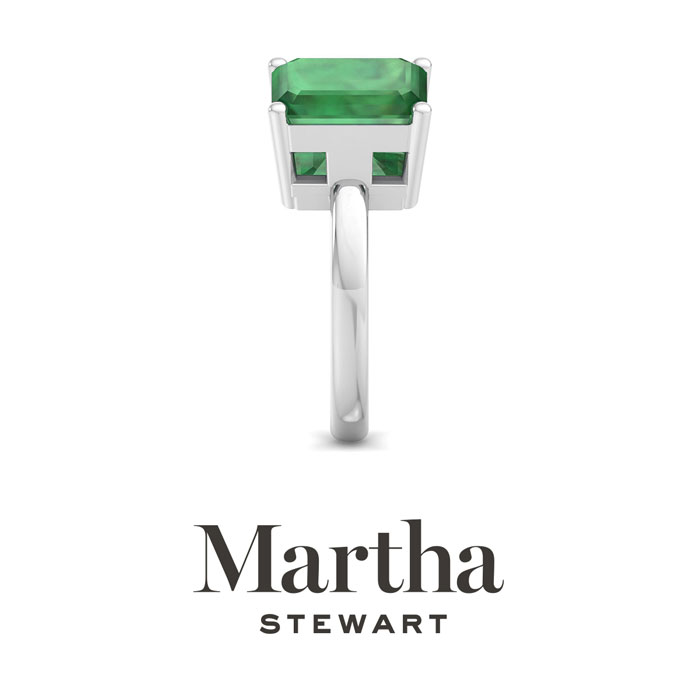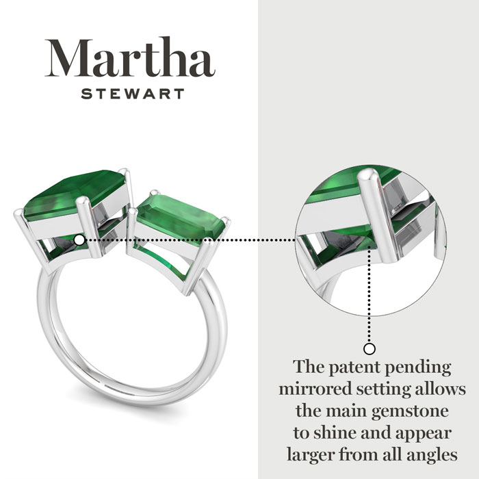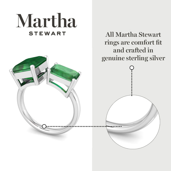 Showcasing class, style and timeless elegance, the Martha Stewart bridge jewelry collection is here to be celebrated. This collection features the finest gemstones and lab grown diamonds set in sterling silver. This Martha Stewart gemstone ring features one 10x8mm emerald cut simulated emerald gemstone weighing 3 carats and one 8x6mm emerald cut simulated emerald gemstone weighing 1 1/2 carats. Total carat weight is approximately 4 1/2 carats. This ring is beautifully crafted in sterling silver, combining quality with timeless style. Featuring a comfort fit band, the Martha Stewart design ensures both secure and comfortable wear for any occasion. This ring showcases a patent-pending mirrored setting, designed to enhance the color and brilliance of the primary gemstone, making it even more captivating.