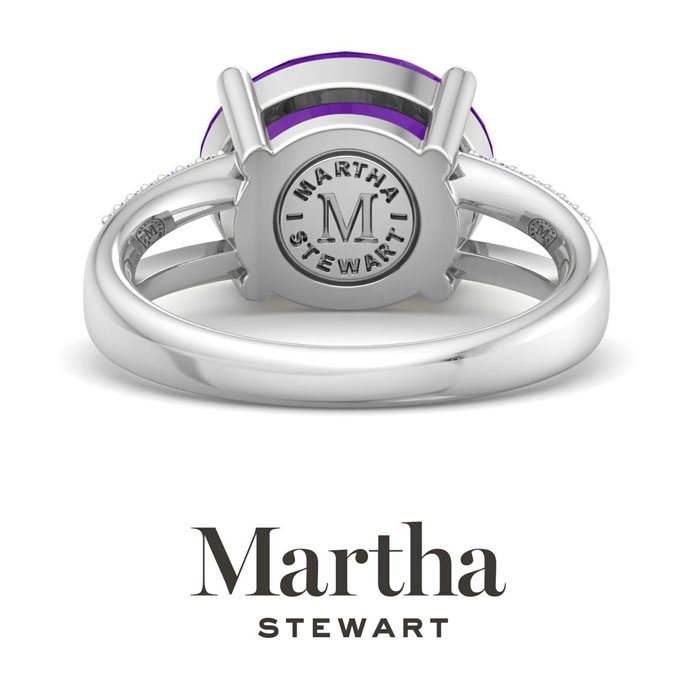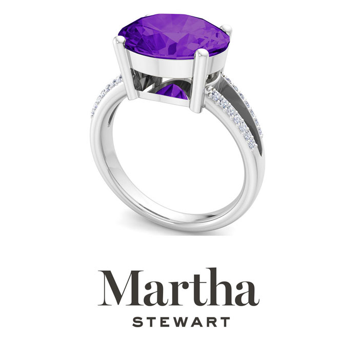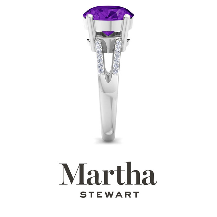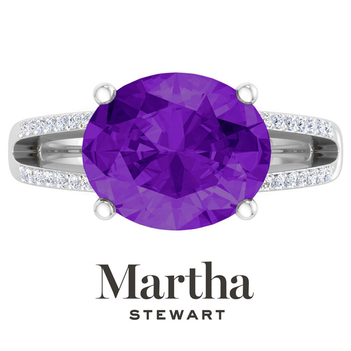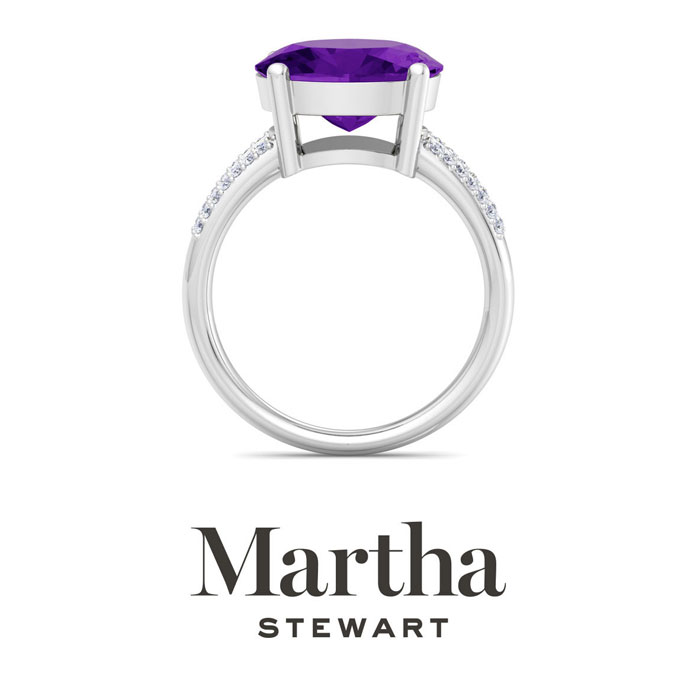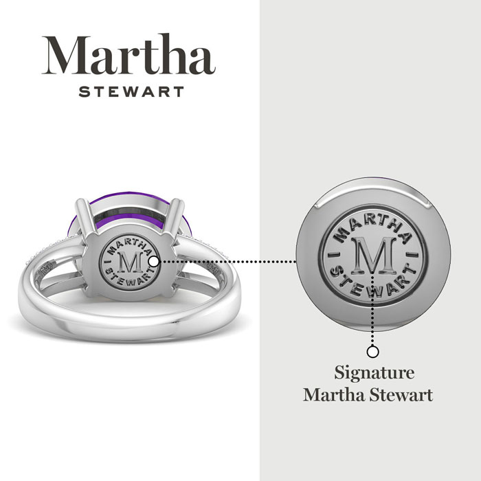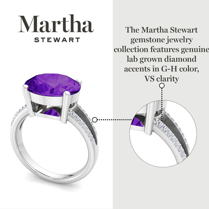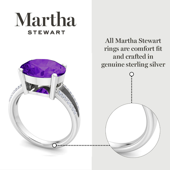 Showcasing class, style and timeless elegance, the Martha Stewart bridge jewelry collection is here to be celebrated. This collection features the finest gemstones and lab grown diamonds set in sterling silver. This Martha Stewart gemstone ring features one 12x10mm oval shape synthetic amethyst gemstone weighing 4 1/2 carats. There are 28 lab grown diamonds in G-H color, VS clarity. Total carat weight is approximately 4.65 carats. This ring is beautifully crafted in sterling silver, combining quality with timeless style. Featuring a comfort fit band, the Martha Stewart design ensures both secure and comfortable wear for any occasion. This ring showcases a patent-pending mirrored setting, designed to enhance the color and brilliance of the primary gemstone, making it even more captivating.