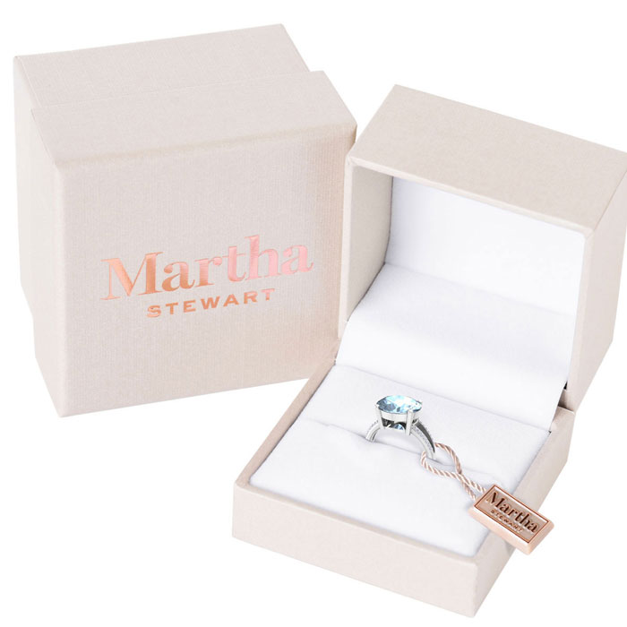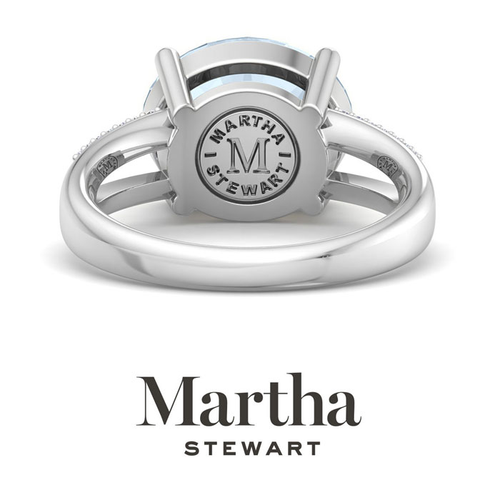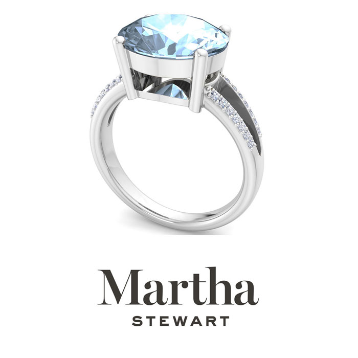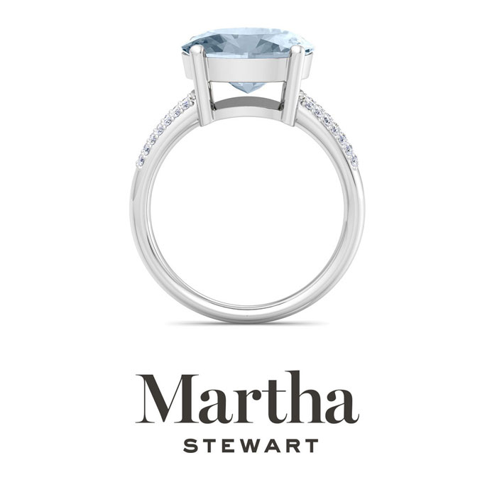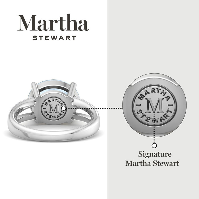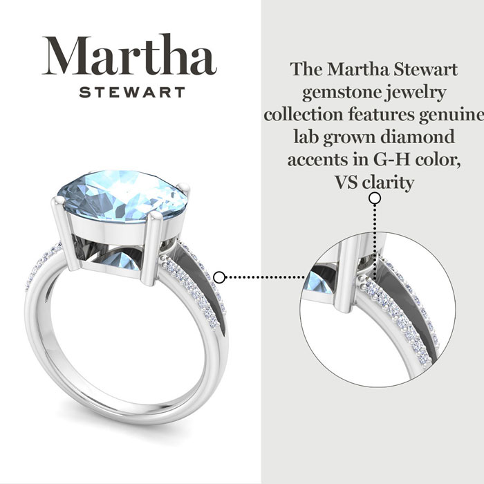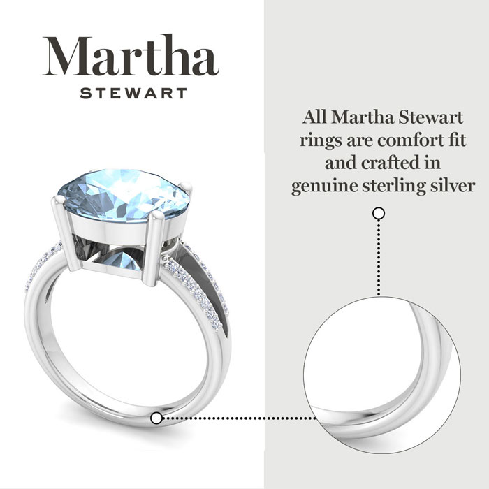 Showcasing class, style and timeless elegance, the Martha Stewart bridge jewelry collection is here to be celebrated. This collection features the finest gemstones and lab grown diamonds set in sterling silver. This Martha Stewart gemstone ring features one 12x10mm oval shape simulated aquamarine gemstone weighing 4 1/2 carats. There are 28 lab grown diamonds in G-H color, VS clarity. Total carat weight is approximately 4.65 carats. This ring is beautifully crafted in sterling silver, combining quality with timeless style. Featuring a comfort fit band, the Martha Stewart design ensures both secure and comfortable wear for any occasion. This ring showcases a patent-pending mirrored setting, designed to enhance the color and brilliance of the primary gemstone, making it even more captivating.