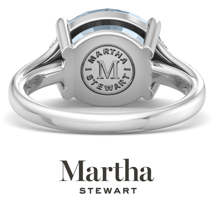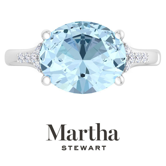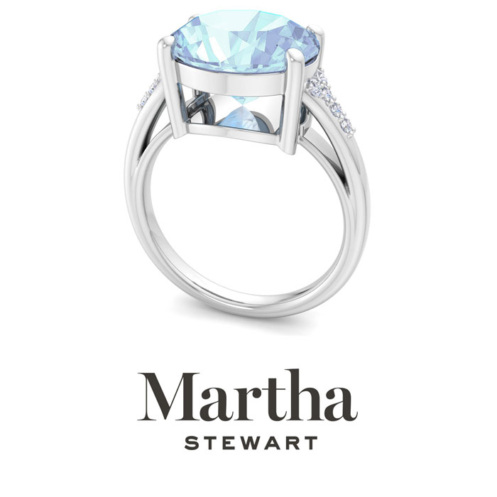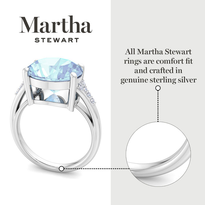 Showcasing class, style and timeless elegance, the Martha Stewart bridge jewelry collection is here to be celebrated. This collection features the finest gemstones and lab grown diamonds set in sterling silver. This Martha Stewart gemstone ring features one 12x10mm oval shape simulated aquamarine gemstone weighing 4 1/2 carats. There are 10 lab grown diamonds in G-H color, VS clarity. Total carat weight is approximately 4.55 carats. This ring is beautifully crafted in sterling silver, combining quality with timeless style. Featuring a comfort fit band, the Martha Stewart design ensures both secure and comfortable wear for any occasion. This ring showcases a patent-pending mirrored setting, designed to enhance the color and brilliance of the primary gemstone, making it even more captivating.