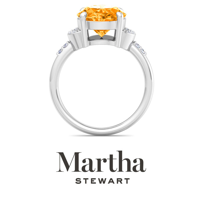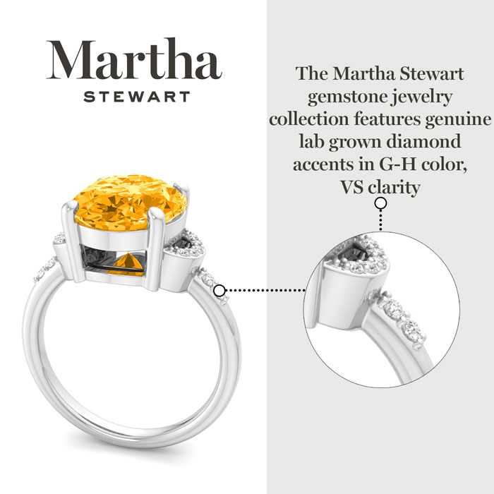 Showcasing class, style and timeless elegance, the Martha Stewart bridge jewelry collection is here to be celebrated. This collection features the finest gemstones and lab grown diamonds set in sterling silver. This Martha Stewart gemstone ring features one 12x10mm oval shape simulated citrine gemstone weighing 4 1/2 carats. There are 10 lab grown diamonds in G-H color, VS clarity. Total carat weight is approximately 4.55 carats. This ring is beautifully crafted in sterling silver, combining quality with timeless style. Featuring a comfort fit band, the Martha Stewart design ensures both secure and comfortable wear for any occasion. This ring showcases a patent-pending mirrored setting, designed to enhance the color and brilliance of the primary gemstone, making it even more captivating.