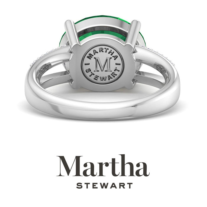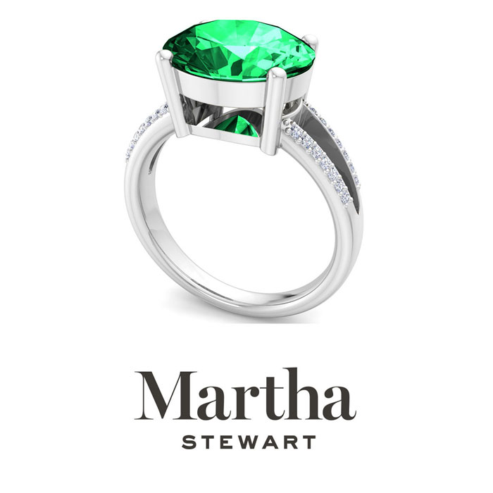 Showcasing class, style and timeless elegance, the Martha Stewart bridge jewelry collection is here to be celebrated. This collection features the finest gemstones and lab grown diamonds set in sterling silver. This Martha Stewart gemstone ring features one 12x10mm oval shape simulated emerald gemstone weighing 4 1/2 carats. There are 28 lab grown diamonds in G-H color, VS clarity. Total carat weight is approximately 4.65 carats. This ring is beautifully crafted in sterling silver, combining quality with timeless style. Featuring a comfort fit band, the Martha Stewart design ensures both secure and comfortable wear for any occasion. This ring showcases a patent-pending mirrored setting, designed to enhance the color and brilliance of the primary gemstone, making it even more captivating.