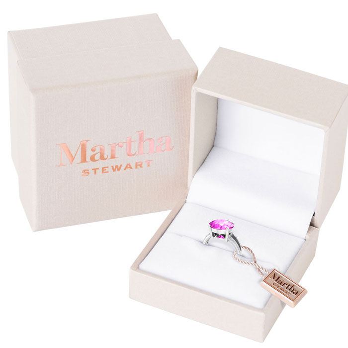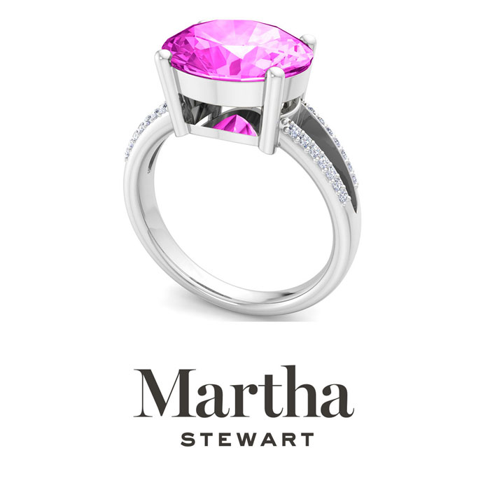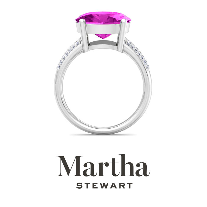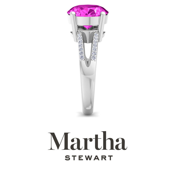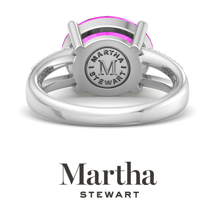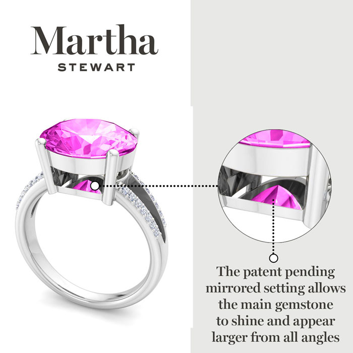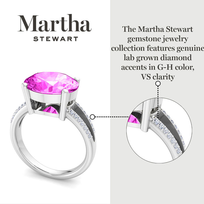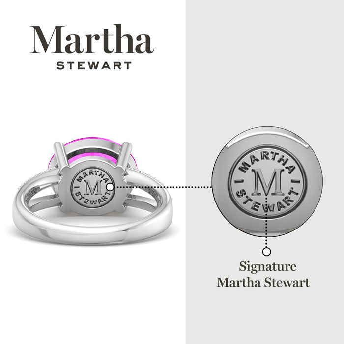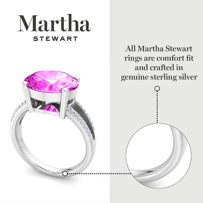 Showcasing class, style and timeless elegance, the Martha Stewart bridge jewelry collection is here to be celebrated. This collection features the finest gemstones and lab grown diamonds set in sterling silver. This Martha Stewart gemstone ring features one 12x10mm oval shape synthetic pink sapphire gemstone weighing 4 1/2 carats. There are 28 lab grown diamonds in G-H color, VS clarity. Total carat weight is approximately 4.65 carats. This ring is beautifully crafted in sterling silver, combining quality with timeless style. Featuring a comfort fit band, the Martha Stewart design ensures both secure and comfortable wear for any occasion. This ring showcases a patent-pending mirrored setting, designed to enhance the color and brilliance of the primary gemstone, making it even more captivating.