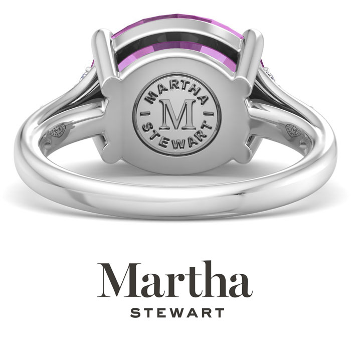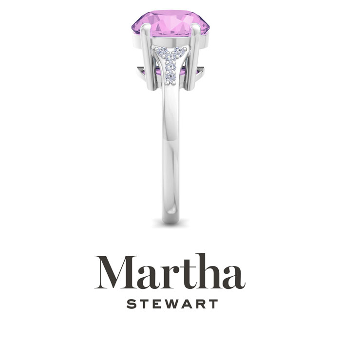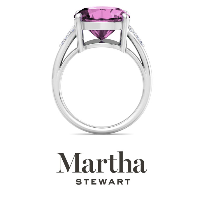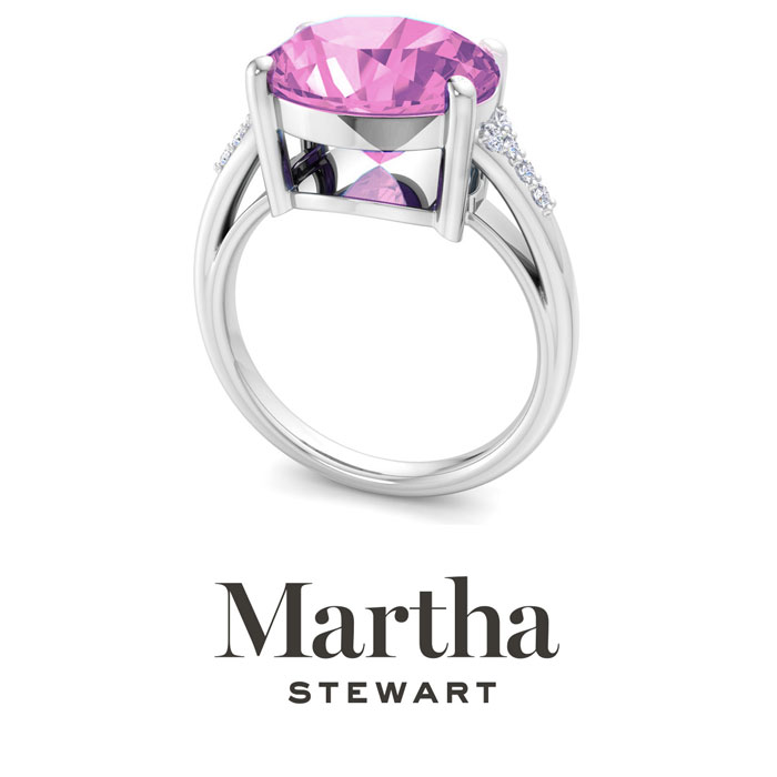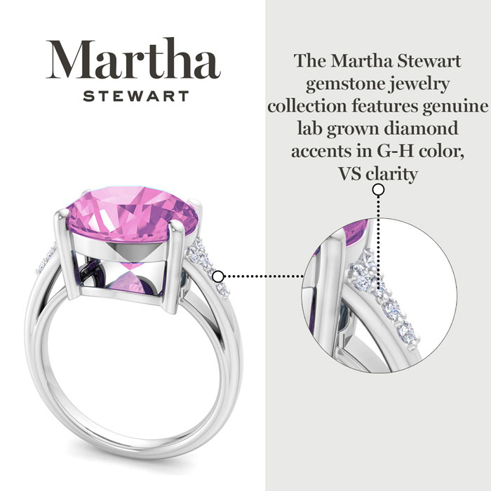 Showcasing class, style and timeless elegance, the Martha Stewart bridge jewelry collection is here to be celebrated. This collection features the finest gemstones and lab grown diamonds set in sterling silver. This Martha Stewart gemstone ring features one 12x10mm oval shape synthetic pink sapphire gemstone weighing 4 1/2 carats. There are 10 lab grown diamonds in G-H color, VS clarity. Total carat weight is approximately 4.55 carats. This ring is beautifully crafted in sterling silver, combining quality with timeless style. Featuring a comfort fit band, the Martha Stewart design ensures both secure and comfortable wear for any occasion. This ring showcases a patent-pending mirrored setting, designed to enhance the color and brilliance of the primary gemstone, making it even more captivating.