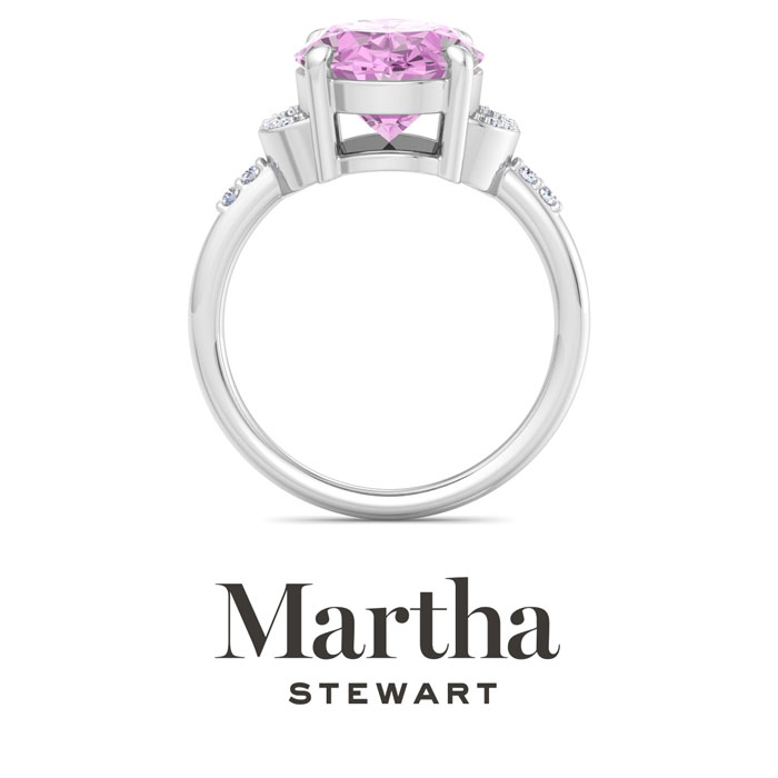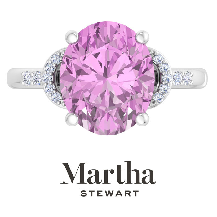 Showcasing class, style and timeless elegance, the Martha Stewart bridge jewelry collection is here to be celebrated. This collection features the finest gemstones and lab grown diamonds set in sterling silver. This Martha Stewart gemstone ring features one 12x10mm oval shape synthetic pink sapphire gemstone weighing 4 1/2 carats. There are 10 lab grown diamonds in G-H color, VS clarity. Total carat weight is approximately 4.55 carats. This ring is beautifully crafted in sterling silver, combining quality with timeless style. Featuring a comfort fit band, the Martha Stewart design ensures both secure and comfortable wear for any occasion. This ring showcases a patent-pending mirrored setting, designed to enhance the color and brilliance of the primary gemstone, making it even more captivating.