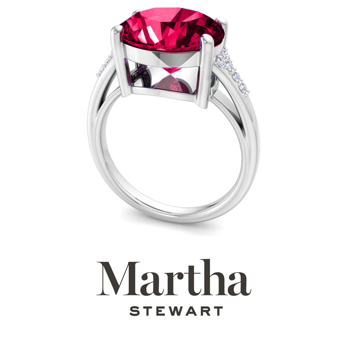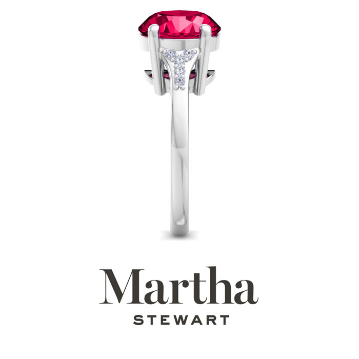 Showcasing class, style and timeless elegance, the Martha Stewart bridge jewelry collection is here to be celebrated. This collection features the finest gemstones and lab grown diamonds set in sterling silver. This Martha Stewart gemstone ring features one 12x10mm oval shape synthetic ruby gemstone weighing 4 1/2 carats. There are 10 lab grown diamonds in G-H color, VS clarity. Total carat weight is approximately 4.55 carats. This ring is beautifully crafted in sterling silver, combining quality with timeless style. Featuring a comfort fit band, the Martha Stewart design ensures both secure and comfortable wear for any occasion. This ring showcases a patent-pending mirrored setting, designed to enhance the color and brilliance of the primary gemstone, making it even more captivating.