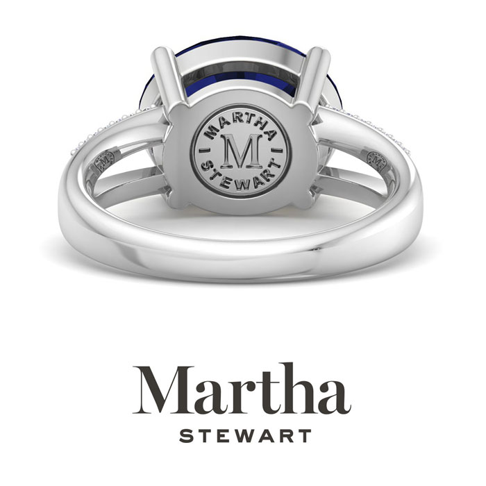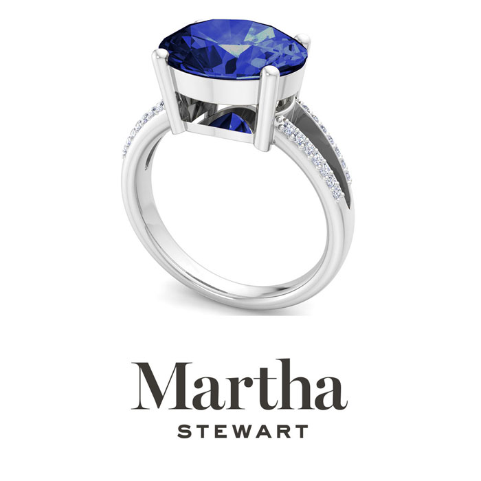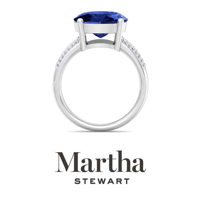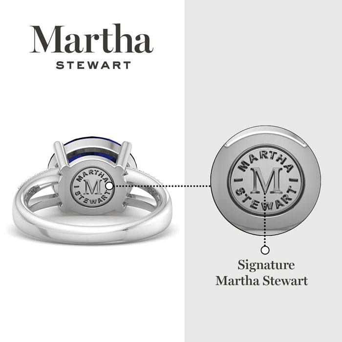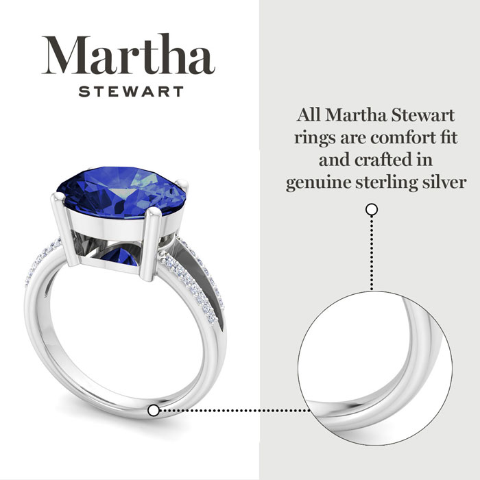 Showcasing class, style and timeless elegance, the Martha Stewart bridge jewelry collection is here to be celebrated. This collection features the finest gemstones and lab grown diamonds set in sterling silver. This Martha Stewart gemstone ring features one 12x10mm oval shape synthetic sapphire gemstone weighing 4 1/2 carats. There are 28 lab grown diamonds in G-H color, VS clarity. Total carat weight is approximately 4.65 carats. This ring is beautifully crafted in sterling silver, combining quality with timeless style. Featuring a comfort fit band, the Martha Stewart design ensures both secure and comfortable wear for any occasion. This ring showcases a patent-pending mirrored setting, designed to enhance the color and brilliance of the primary gemstone, making it even more captivating.