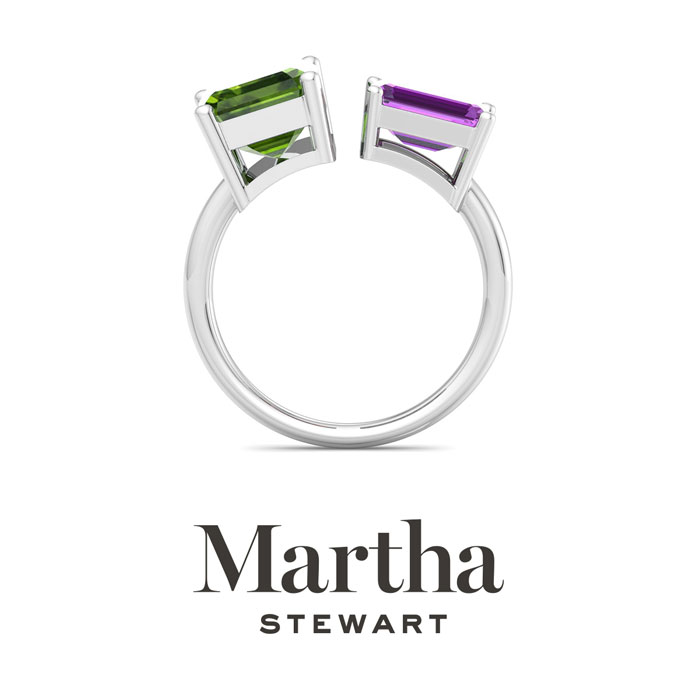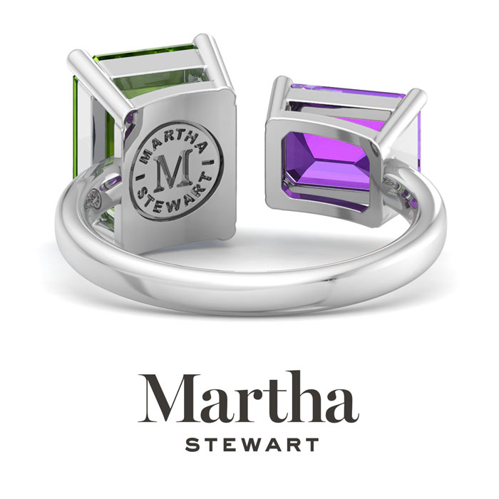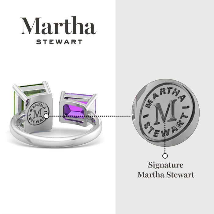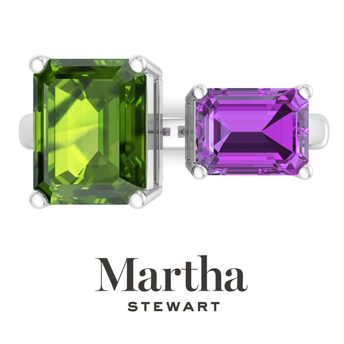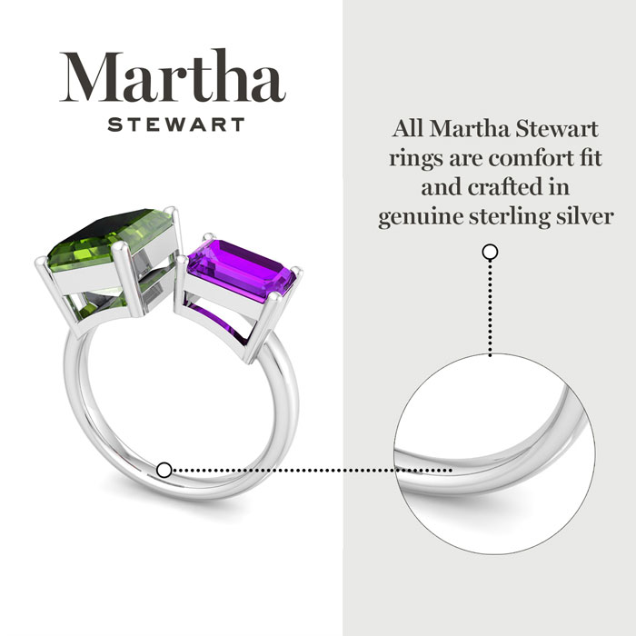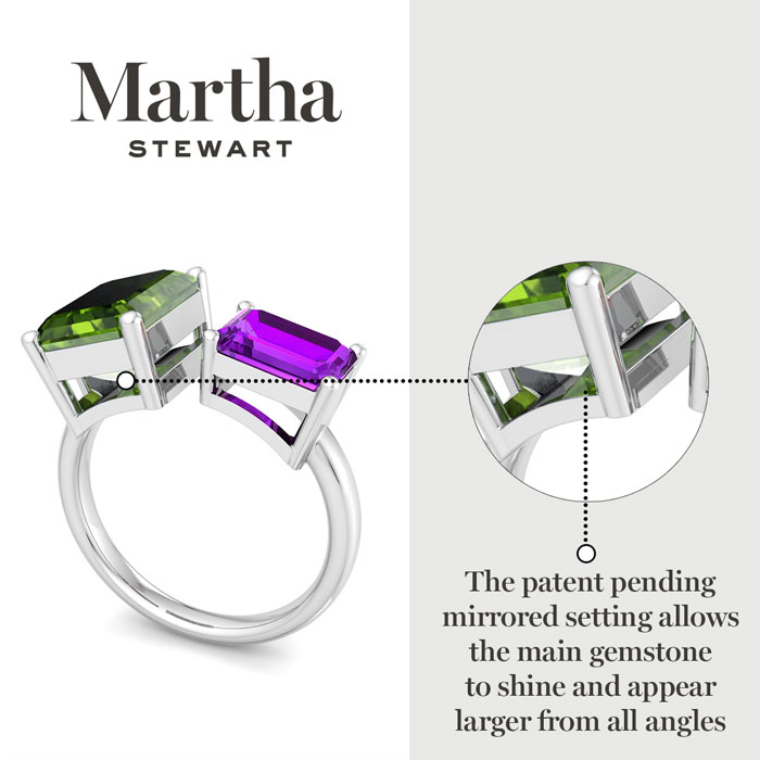Showcasing class, style and timeless elegance, the Martha Stewart bridge jewelry collection is here to be celebrated. This collection features the finest gemstones and lab grown diamonds set in sterling silver. This Martha Stewart gemstone ring features one 10x8mm emerald cut simulated peridot gemstone weighing 3 carats and one 8x6mm emerald cut synthetic amethyst gemstone weighing 1 1/2 carats. Total carat weight is approximately 4 1/2 carats. This ring is beautifully crafted in sterling silver, combining quality with timeless style. Featuring a comfort fit band, the Martha Stewart design ensures both secure and comfortable wear for any occasion. This ring also has a patent pending mirrogreen setting.