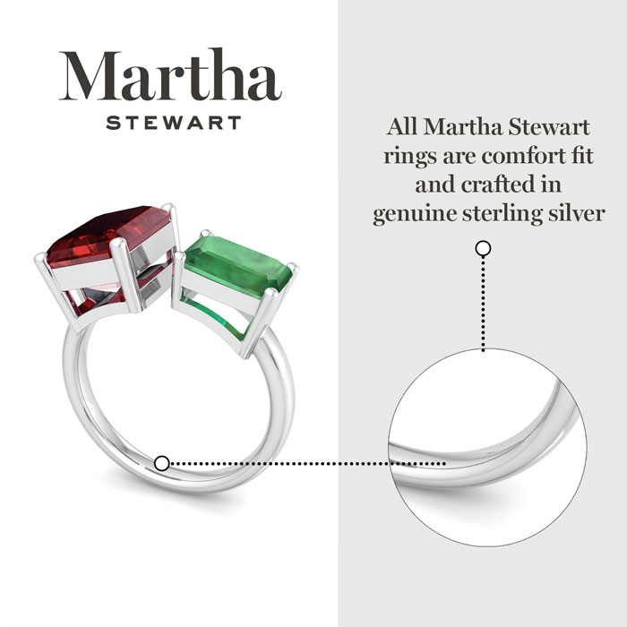 Showcasing class, style and timeless elegance, the Martha Stewart bridge jewelry collection is here to be celebrated. This collection features the finest gemstones and lab grown diamonds set in sterling silver. This Martha Stewart gemstone ring features one 10x8mm emerald cut synthetic ruby gemstone weighing 3 carats and one 8x6mm emerald cut simulated emerald gemstone weighing 1 1/2 carats. Total carat weight is approximately 4 1/2 carats. This ring is beautifully crafted in sterling silver, combining quality with timeless style. Featuring a comfort fit band, the Martha Stewart design ensures both secure and comfortable wear for any occasion. This ring showcases a patent-pending mirrored setting, designed to enhance the color and brilliance of the primary gemstone, making it even more captivating.
