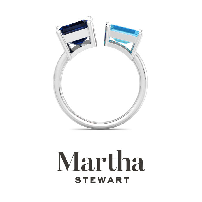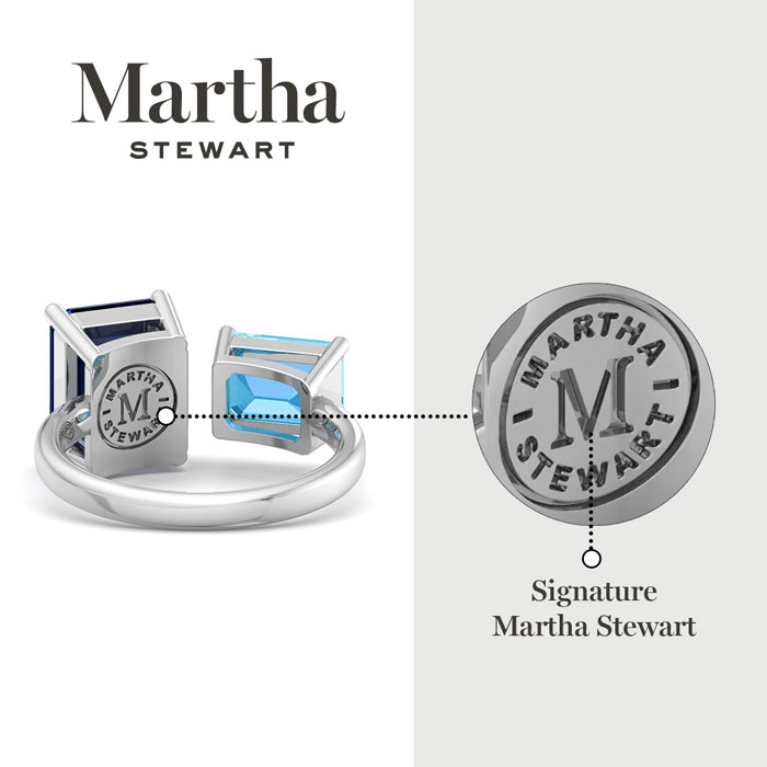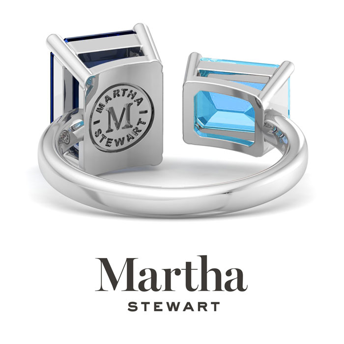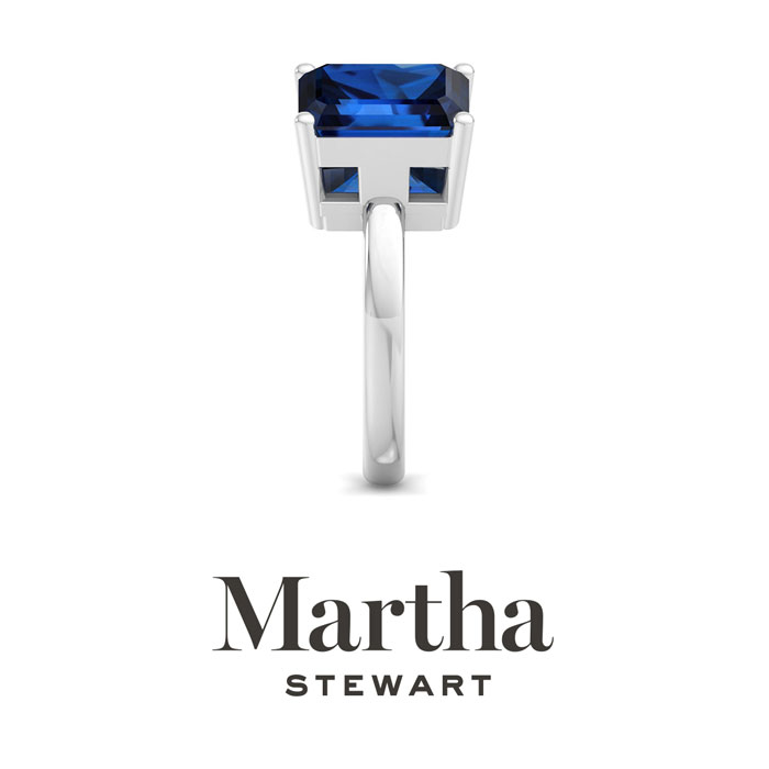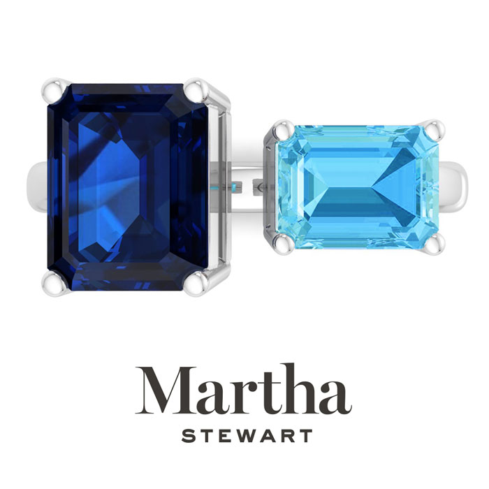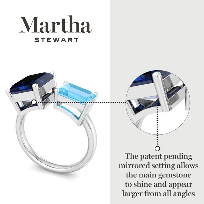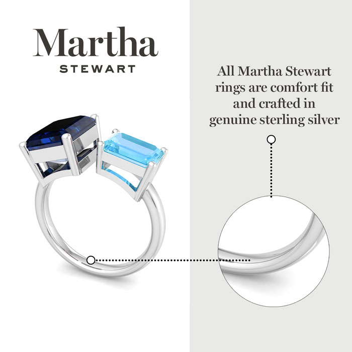Showcasing class, style and timeless elegance, the Martha Stewart bridge jewelry collection is here to be celebrated. This collection features the finest gemstones and lab grown diamonds set in sterling silver. This Martha Stewart gemstone ring features one 10x8mm emerald cut synthetic sapphire gemstone weighing 3 carats and one 8x6mm emerald cut simulated blue topaz gemstone weighing 1 1/2 carats. Total carat weight is approximately 4 1/2 carats. This ring is beautifully crafted in sterling silver, combining quality with timeless style. Featuring a comfort fit band, the Martha Stewart design ensures both secure and comfortable wear for any occasion. This ring showcases a patent-pending mirrored setting, designed to enhance the color and brilliance of the primary gemstone, making it even more captivating.