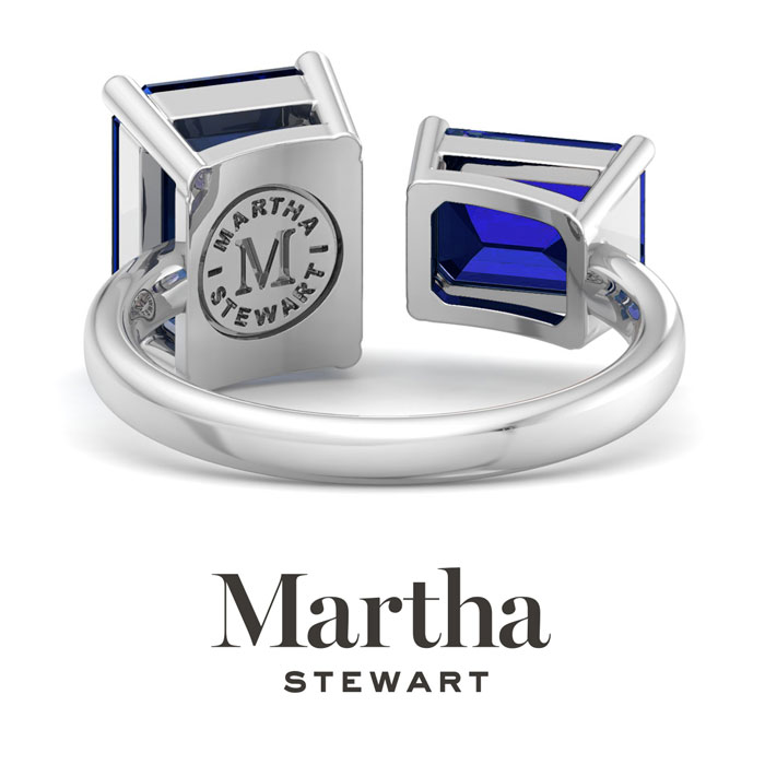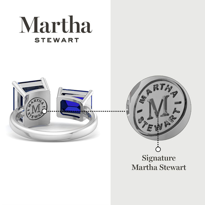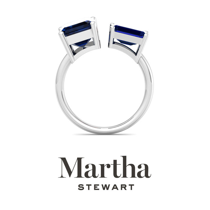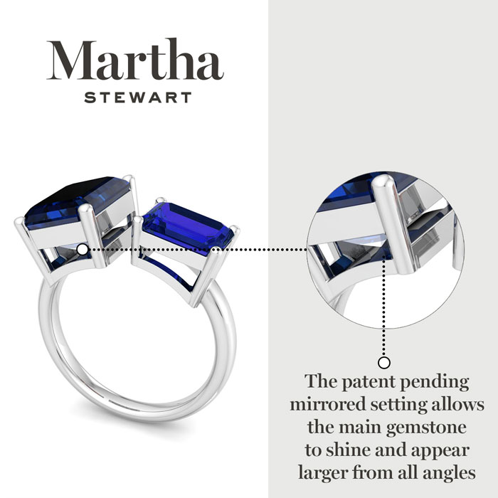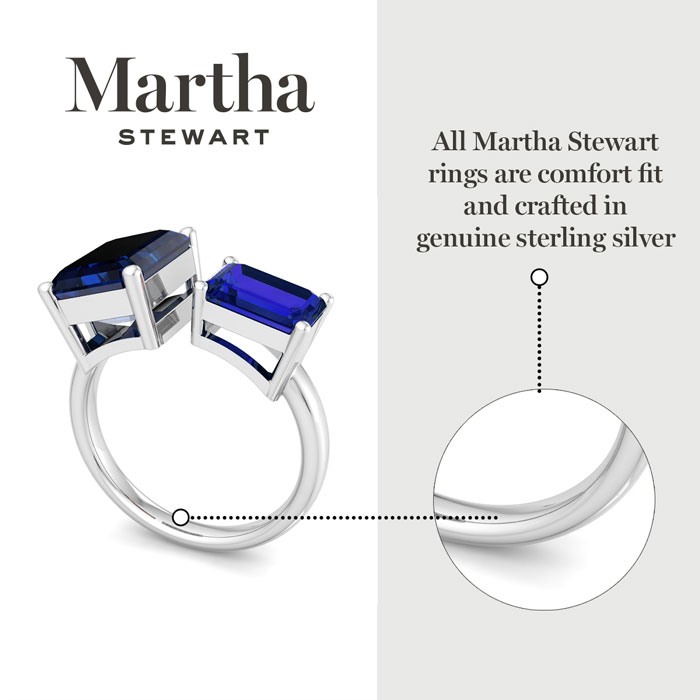 Showcasing class, style and timeless elegance, the Martha Stewart bridge jewelry collection is here to be celebrated. This collection features the finest gemstones and lab grown diamonds set in sterling silver. This Martha Stewart gemstone ring features one 10x8mm emerald cut synthetic sapphire gemstone weighing 3 carats and one 8x6mm emerald cut synthetic sapphire gemstone weighing 1 1/2 carats. Total carat weight is approximately 4 1/2 carats. This ring is beautifully crafted in sterling silver, combining quality with timeless style. Featuring a comfort fit band, the Martha Stewart design ensures both secure and comfortable wear for any occasion. This ring showcases a patent-pending mirrored setting, designed to enhance the color and brilliance of the primary gemstone, making it even more captivating.