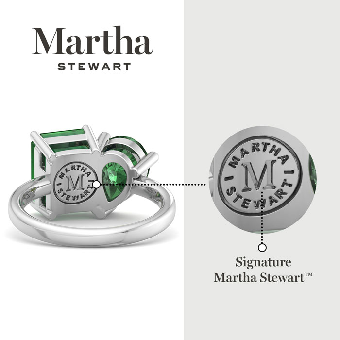 Showcasing class, style and timeless elegance, the Martha Stewart bridge jewelry collection is here to be celebrated. This collection features the finest gemstones and lab grown diamonds set in sterling silver. This Martha Stewart gemstone ring features one 10x8mm emerald cut simulated emerald gemstone weighing 3 carats and one 10x7mm pear shape simulated emerald gemstone weighing 1 3/4 carats. Total carat weight is approximately 4 3/4 carats. This ring is beautifully crafted in sterling silver, combining quality with timeless style. Featuring a comfort fit band, the Martha Stewart design ensures both secure and comfortable wear for any occasion. This ring showcases a patent-pending mirrored setting, designed to enhance the color and brilliance of the primary gemstone, making it even more captivating.