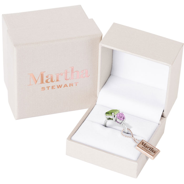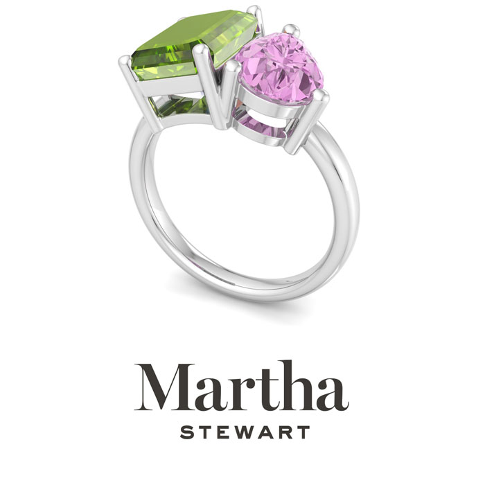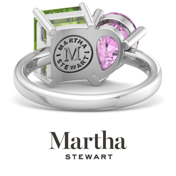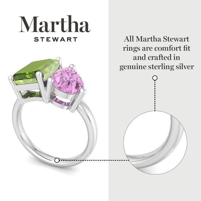 Showcasing class, style and timeless elegance, the Martha Stewart bridge jewelry collection is here to be celebrated. This collection features the finest gemstones and lab grown diamonds set in sterling silver. This Martha Stewart gemstone ring features one 10x8mm emerald cut simulated peridot gemstone weighing 3 carats and one 10x7mm pear shape synthetic pink sapphire gemstone weighing 1 3/4 carats. Total carat weight is approximately 4 3/4 carats. This ring is beautifully crafted in sterling silver, combining quality with timeless style. Featuring a comfort fit band, the Martha Stewart design ensures both secure and comfortable wear for any occasion. This ring showcases a patent-pending mirrored setting, designed to enhance the color and brilliance of the primary gemstone, making it even more captivating.