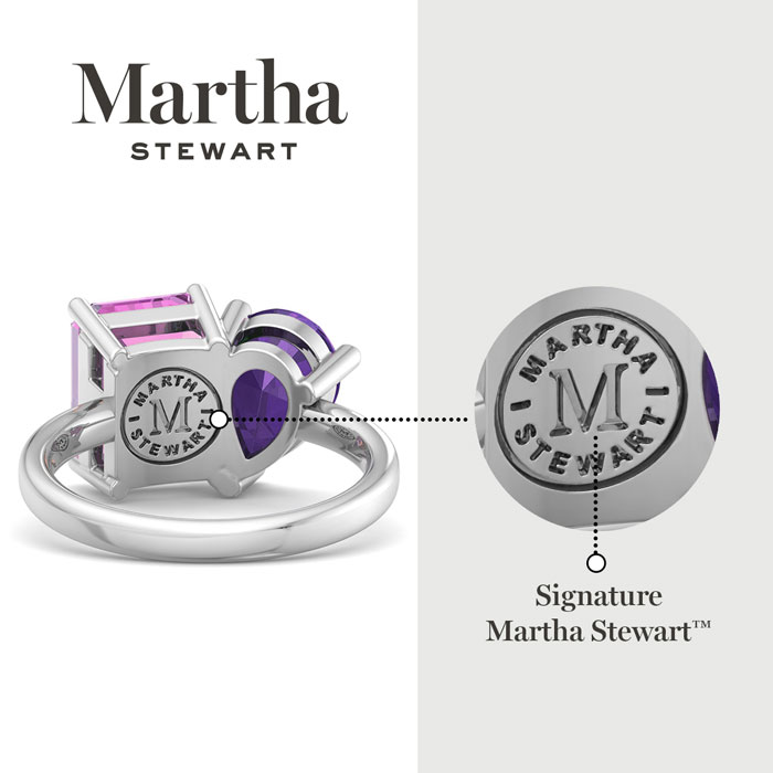Showcasing class, style and timeless elegance, the Martha Stewart bridge jewelry collection is here to be celebrated. This collection features the finest gemstones and lab grown diamonds set in sterling silver. This Martha Stewart gemstone ring features one 10x8mm emerald cut synthetic pink sapphire gemstone weighing 3 carats and one 10x7mm pear shape synthetic amethyst gemstone weighing 1 3/4 carats. Total carat weight is approximately 4 3/4 carats. This ring is beautifully crafted in sterling silver, combining quality with timeless style. Featuring a comfort fit band, the Martha Stewart design ensures both secure and comfortable wear for any occasion. This ring showcases a patent-pending mirrored setting, designed to enhance the color and brilliance of the primary gemstone, making it even more captivating.